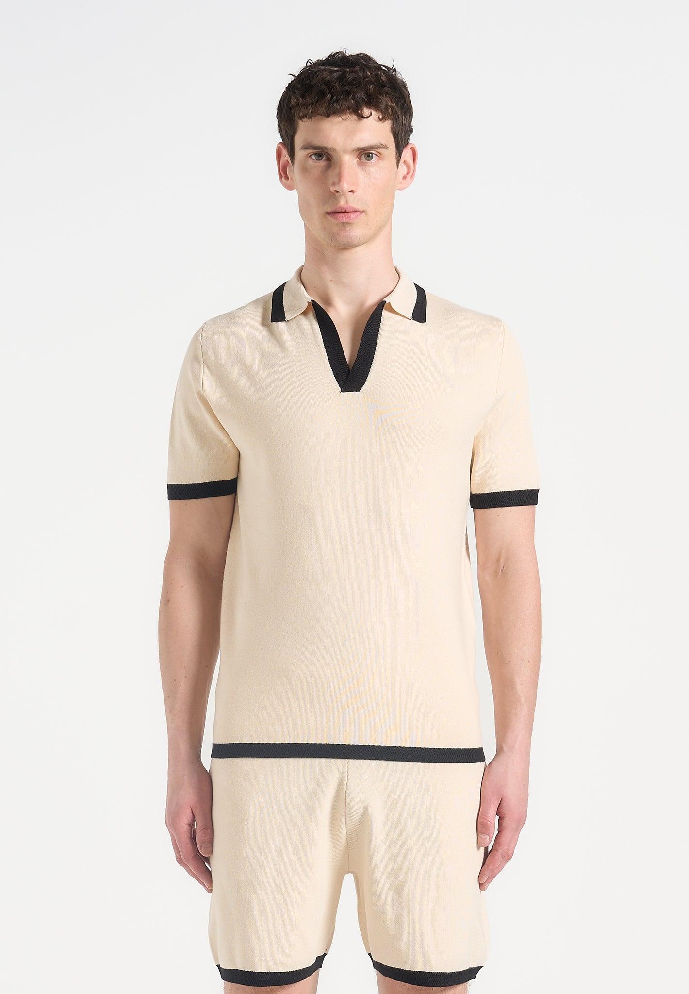 Redefining the classic polo, the Contrast Detail Knit Polo Shirt introduces bold tonal blocking and a sculpted knit texture for a refined yet athletic aesthetic. The open placket neckline adds a sleek, contemporary edge, while the contrast collar and cuffs sharpen the silhouette with intentional visual breaks—ideal for elevated everyday styling. Tonal Contrast Collar, Cuffs, and Placket for Visual Definition Engineered Knit Fabric with Breathable Structure Open V-Placket Neckline for a Modern Finish Ribbed Trims for Sculpted Sleeve and Hem Slightly Tailored Body for a Clean Drape Silver Manière De Voir Eiffel Plaque on Back 80% Viscose, 20% Nylon / 80% Viscose, 20% NylonAlways check the care label for wash instructions.