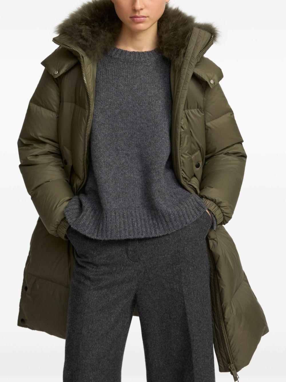 Yves Salomon lambshearling-trimmed hooded coat | Green | olive green | lambshearling collar trim | hooded | quilted design | zip fastening | long sleeves | Polyamide/Lamb Shearling/Duck Down/Duck Feathers | Oversized Coats | Coats | Clothing | Women