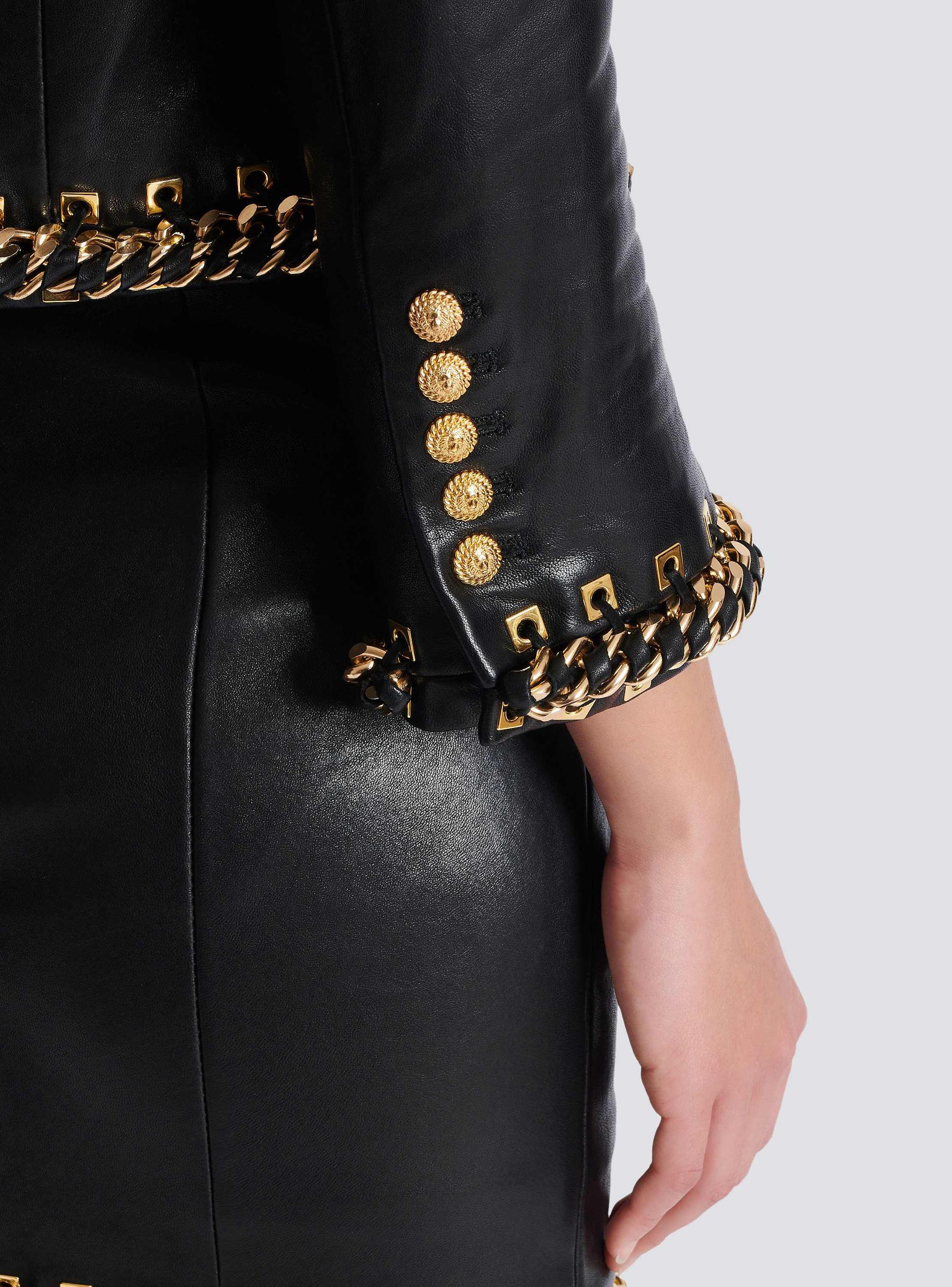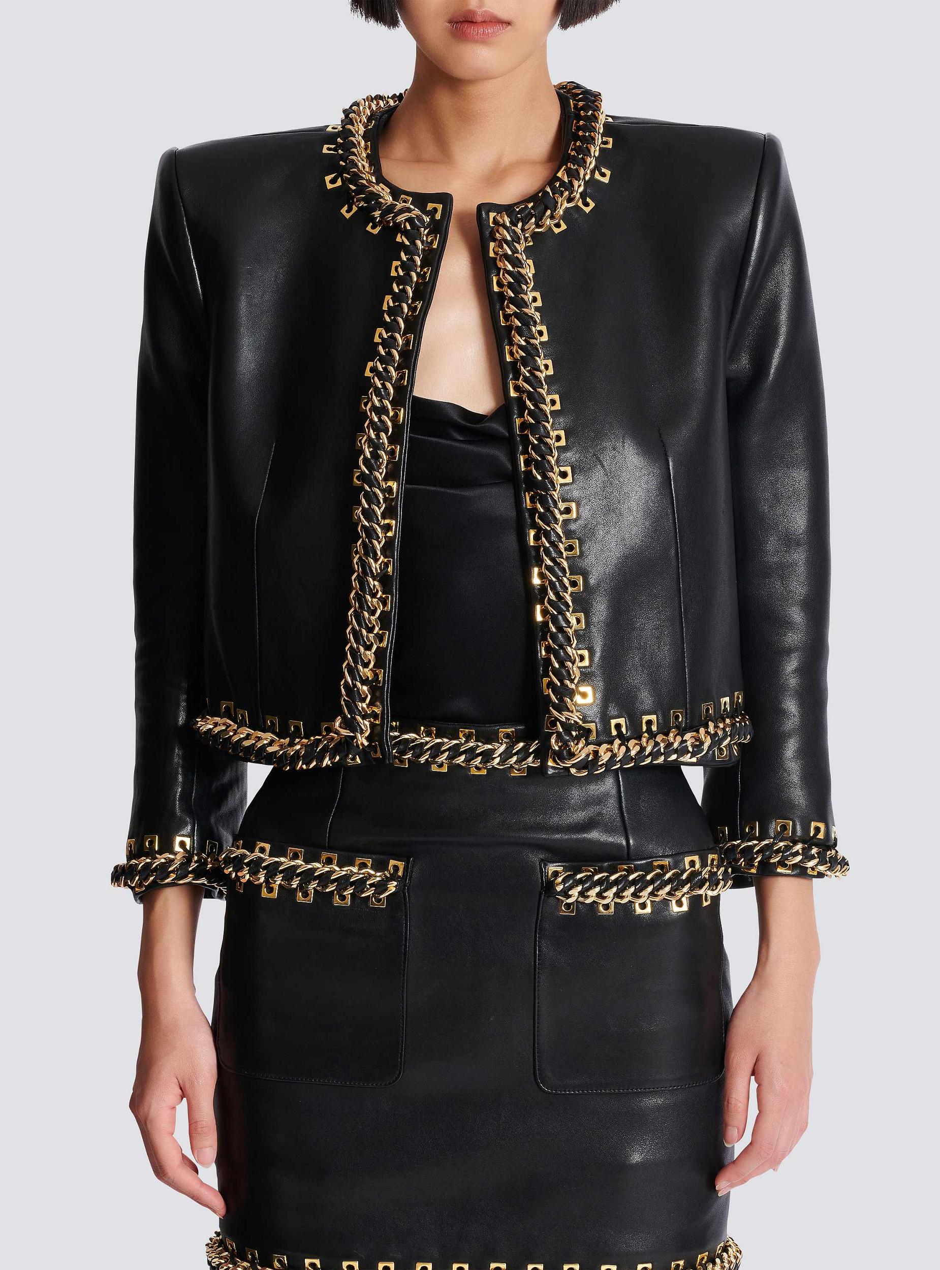 Lambskin edge-to-edge jacket with chain trimRound necklineTextured trim with braided chains and eyeletsStructured shouldersLong sleevesInside slash pocketTwill liningCropped fitModel measures 178cm and wears a size 36Main material: 100% lambskinMade in TurkeyItem: EF0SK776LC62