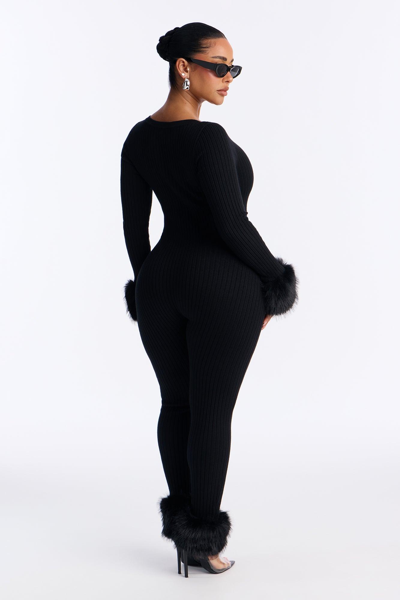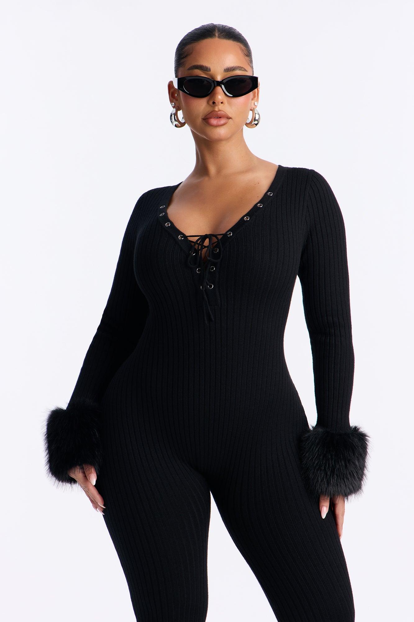 Available In Black. Jumpsuit Stretch Long Sleeve Lace Up Neck Skinny Leg Fur Trim 30" Inseam Self: 50% Viscose 28% Polyester 22% Nylon Faux Fur: 100% Polyester Imported California Proposition 65WARNING: Cancer and Reproductive Harm - www.P65Warnings.ca.gov.