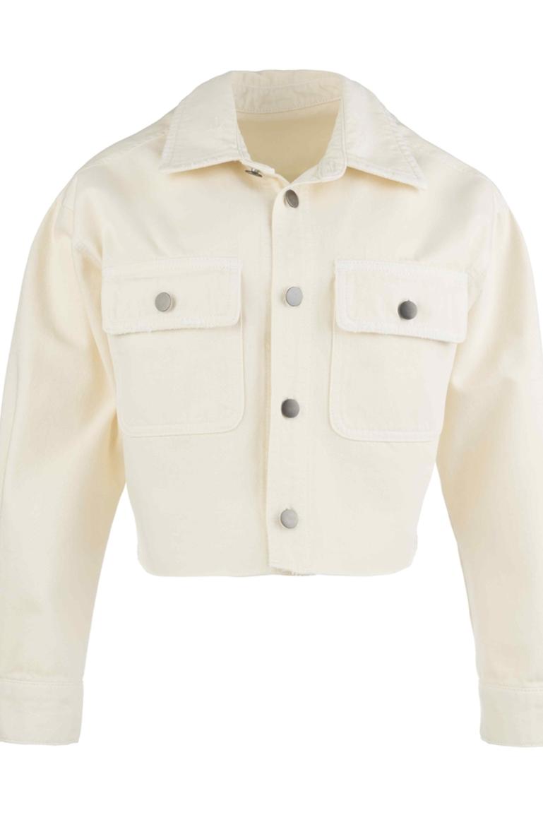 This denim jacket features a stylish frayed hem, drop shoulder design, and patch front pockets, offering a perfect blend of casual cool and modern trendiness. The relaxed fit and thoughtful details make it an effortlessly chic addition to any casual wardrobe.