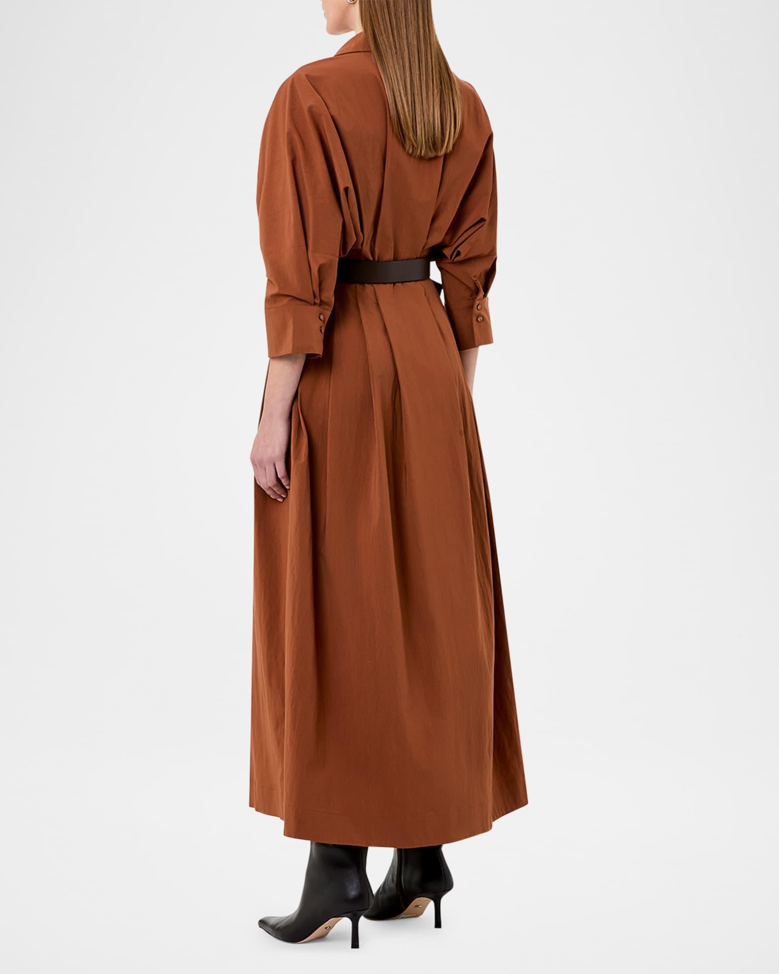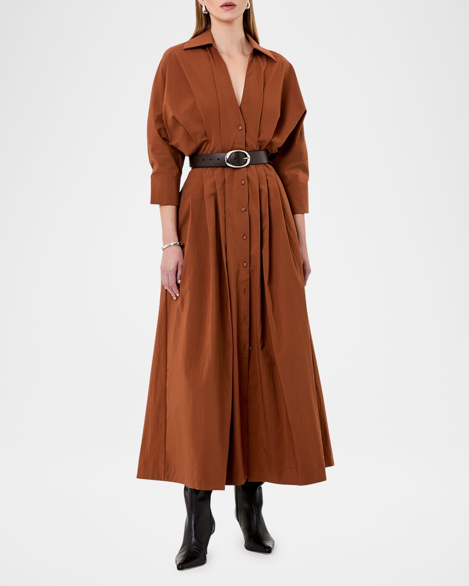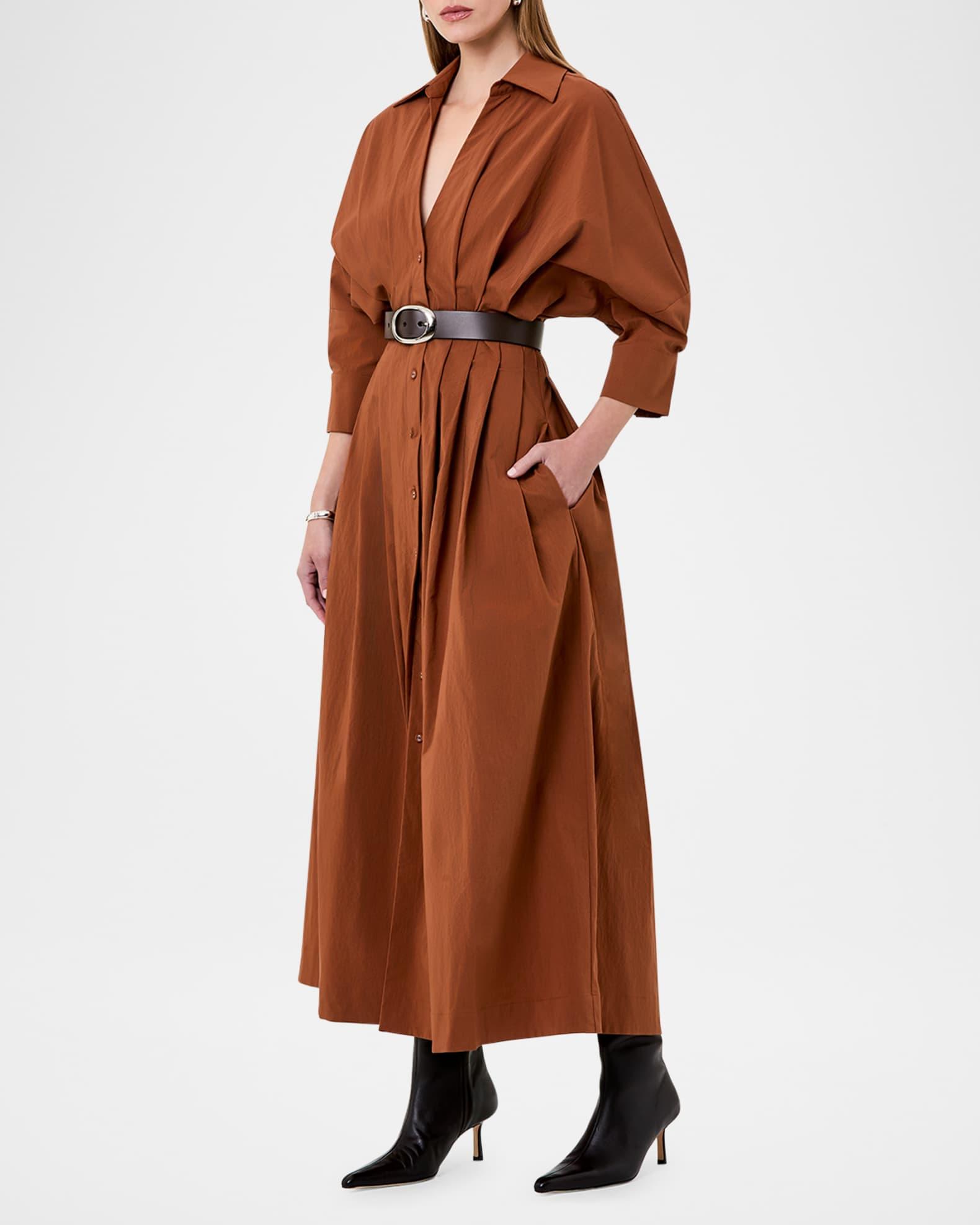NICHOLAS "Lanae" maxi shirtdress gathered with figure-accentuating pleating along the waist Approx. 53"L from shoulders to hem V neckline with spread collar Button front closure 3/4 dolman sleeves Button cuffs On-seam pockets Hem falls below the knee A-line silhouette Cotton/nylon/polyamide Dry clean Imported