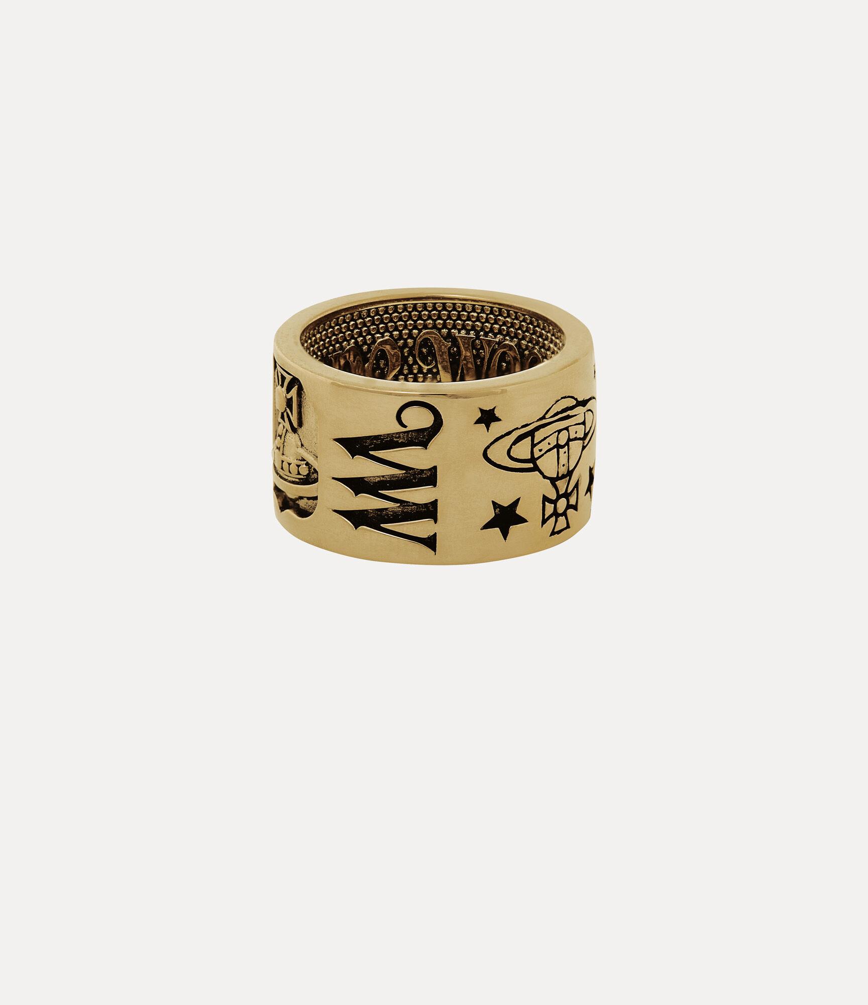 The Lancelot ring, crafted from gold-tone plated recycled silver, is inscribed with signature phrases and motifs inspired by the house's history. The wide statement band is finished with antique-effect detailing, while the inner band features an embossed 'Vivienne Westwood' inscription in the signature lettering.