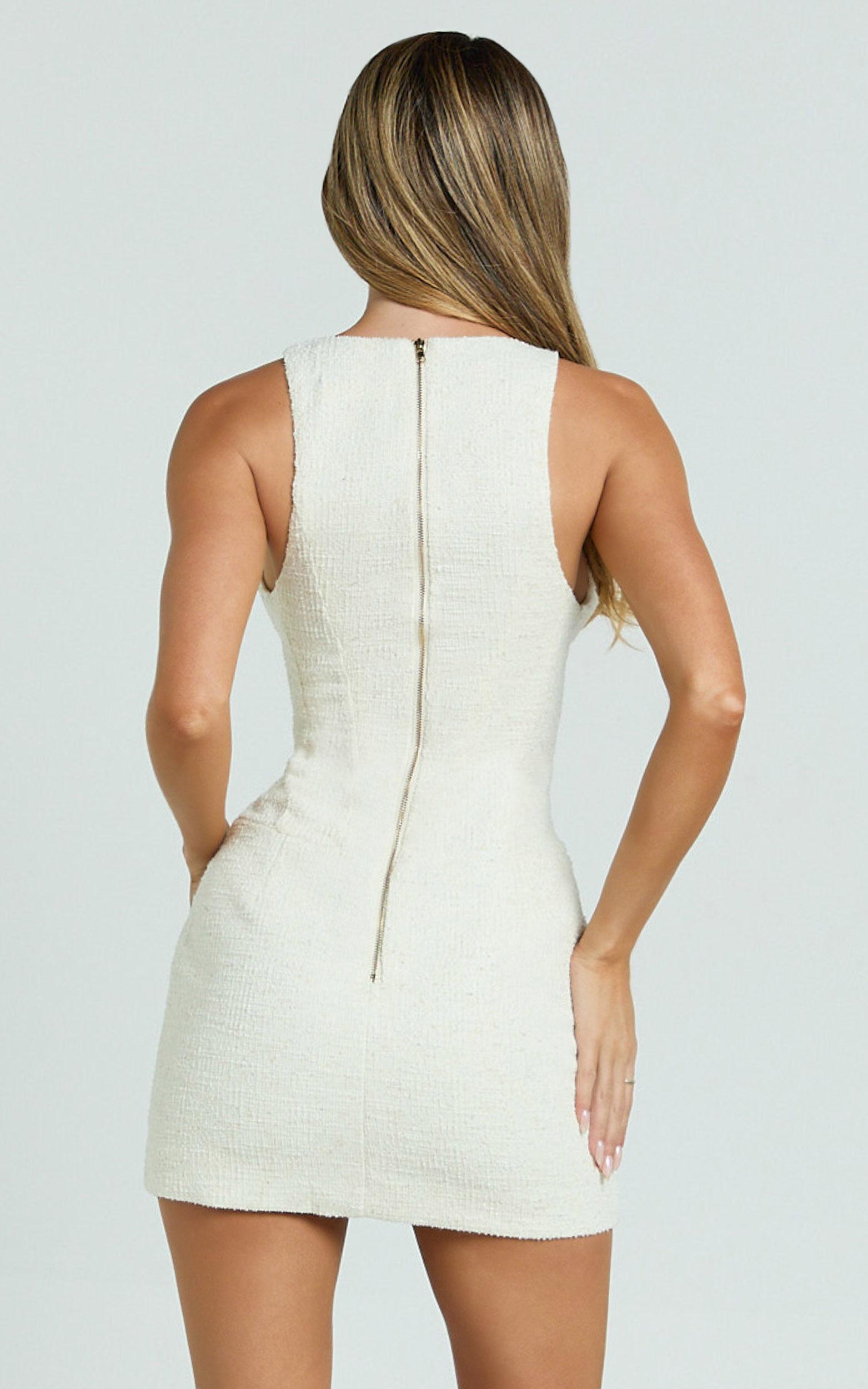 Featuring a flattering scoop neckline and racerback detail, this stunning white tulip dress hugs your curves for a beautifully feminine silhouette. Perfect for brunch dates or nights spent dancing, pair it with gladiator sandals for a relaxed, boho-inspired look, or style it with crisp white sneakers for a playful yet sleek vibe.The Landon Mini Dress flatters from every angle, offering versatile elegance that's ideal for any occasion, whether you're strolling through town or enjoying sunset dates by the beach. Stylishly simple and subtly flirty, it's everything a dreamy dress should be!Product Details:Zips featureInner LiningBodycon DressBoucle fabricScoop necklineParty Day essentialMini lengthSleeveless designPolyester materialMaterial and CareMain Fabric: 97% Polyester, 3% Spandex Lining: 100% PolyesterLow Stretch