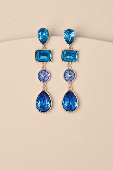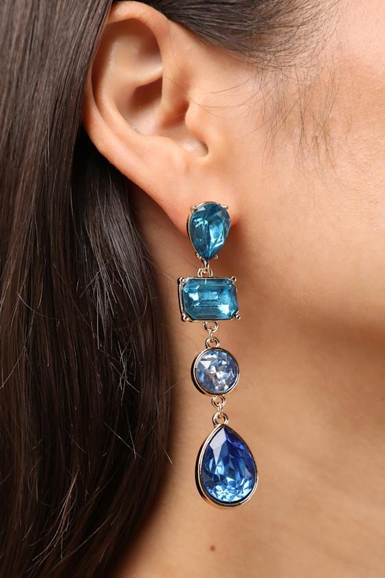 Everyone will admire your accessorizing skills when you arrive adorned with these stunning earrings, complete with gold-toned settings and bright blue-hued rhinestones in various shapes. The shoulder-dusting drop-style silhouette will dangle elegantly from each ear.