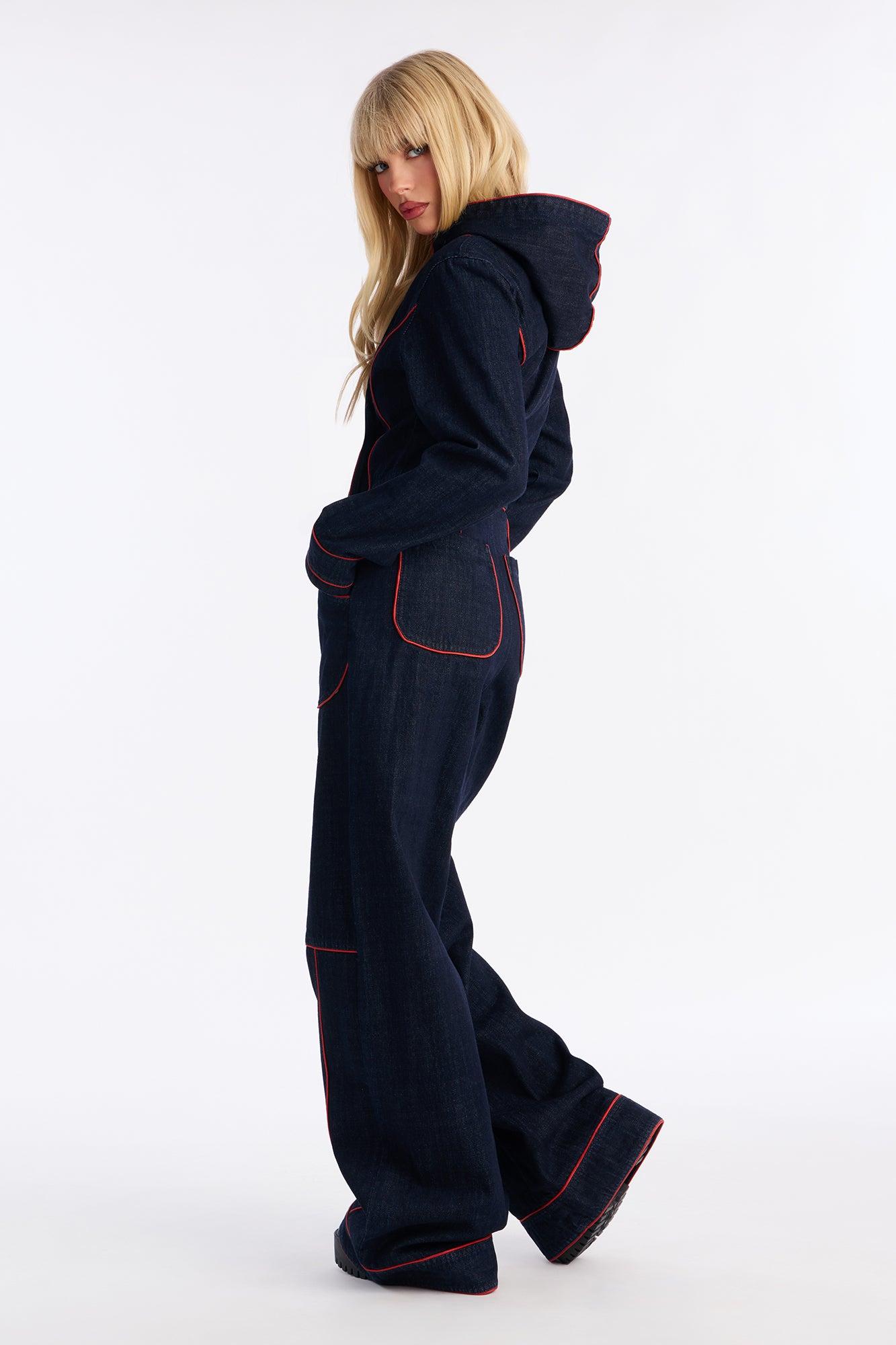 Available In Dark Wash. Jumpsuit Non-stretch Long Sleeve Hooded Zipper Front Closure Wide Leg Pockets 34.5" Inseam Disclaimer: Due To The Specialized Wash, Each Garment Is Unique. Self: 87.1% Cotton 10% Viscose 2.9% Polyester Imported California Proposition 65WARNING: Cancer and Reproductive Harm - www.P65Warnings.ca.gov.
