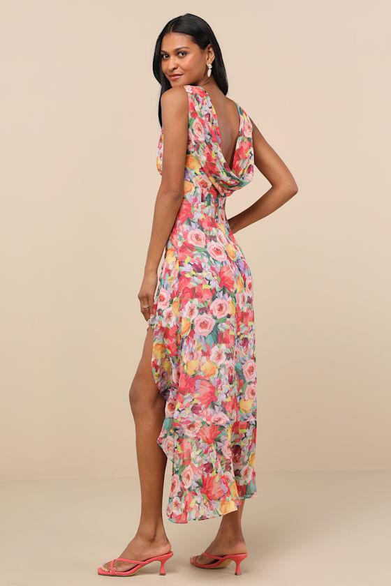 Make it a day to remember with a look as sensational as this flattering floral maxi, crafted with a lightweight fabrication and a summery sleeveless design. The plunging bodice features an empire waist silhouette that flows into a figure-skimming silhouette, emphasized by a ruffled side slit that creates a high-low effect at the hem. A head-turning, low cowl back lends an event-ready finish. Hidden side zipper/clasp.
