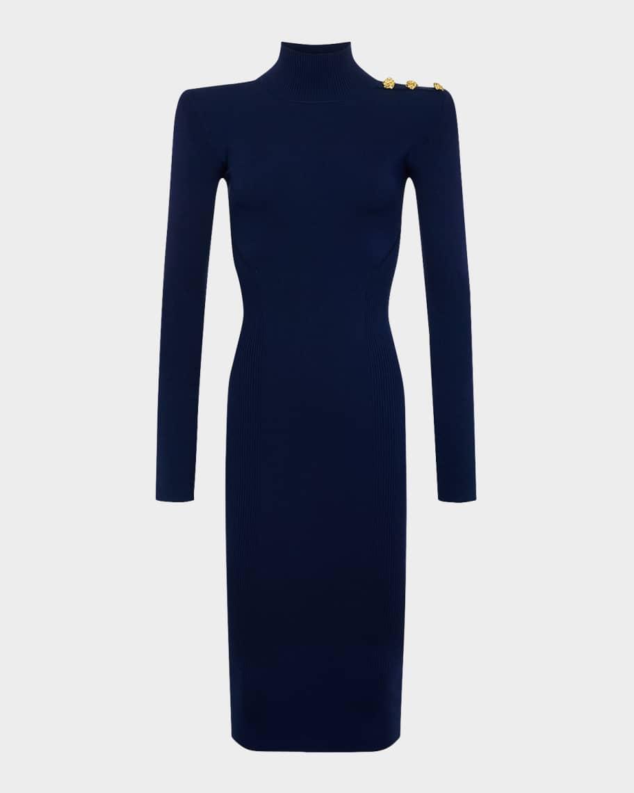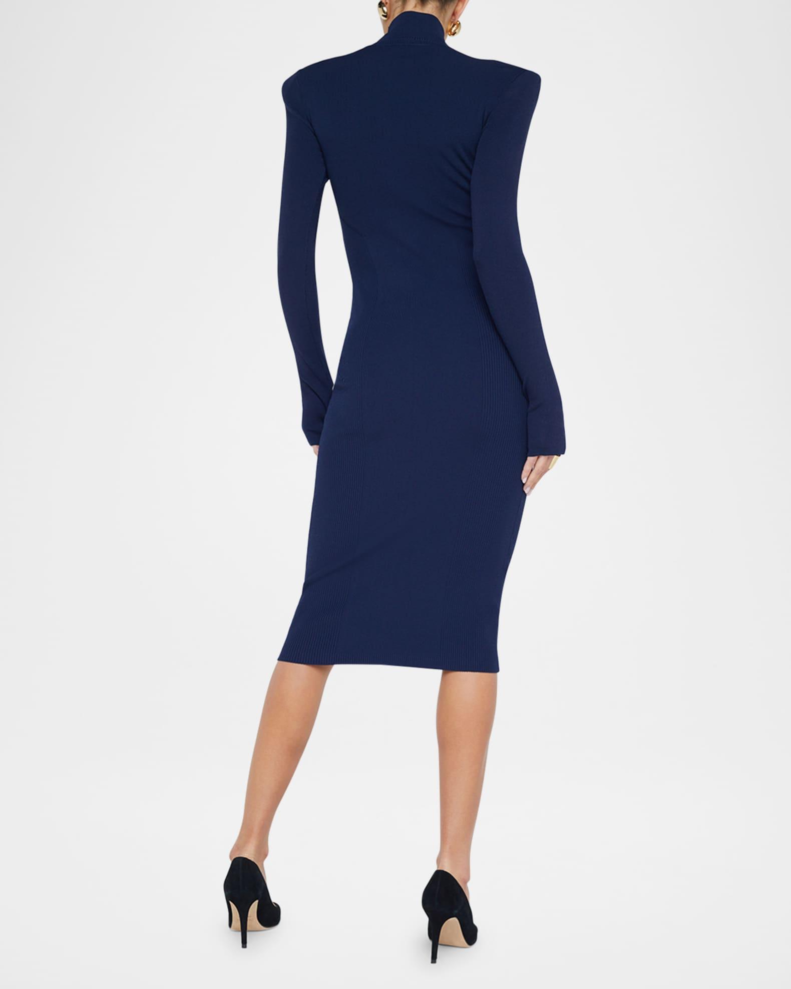 L'Agence "Larelle" ribbed midi dress featuring structured shoulders with button detailing Mock neckline Long sleeves with thumbholes Bodycon silhouette Hem hits around the knee Slipover style Promodal® rayon/Amni® nylon/spandex Imported Model is 5'10"/177cm.