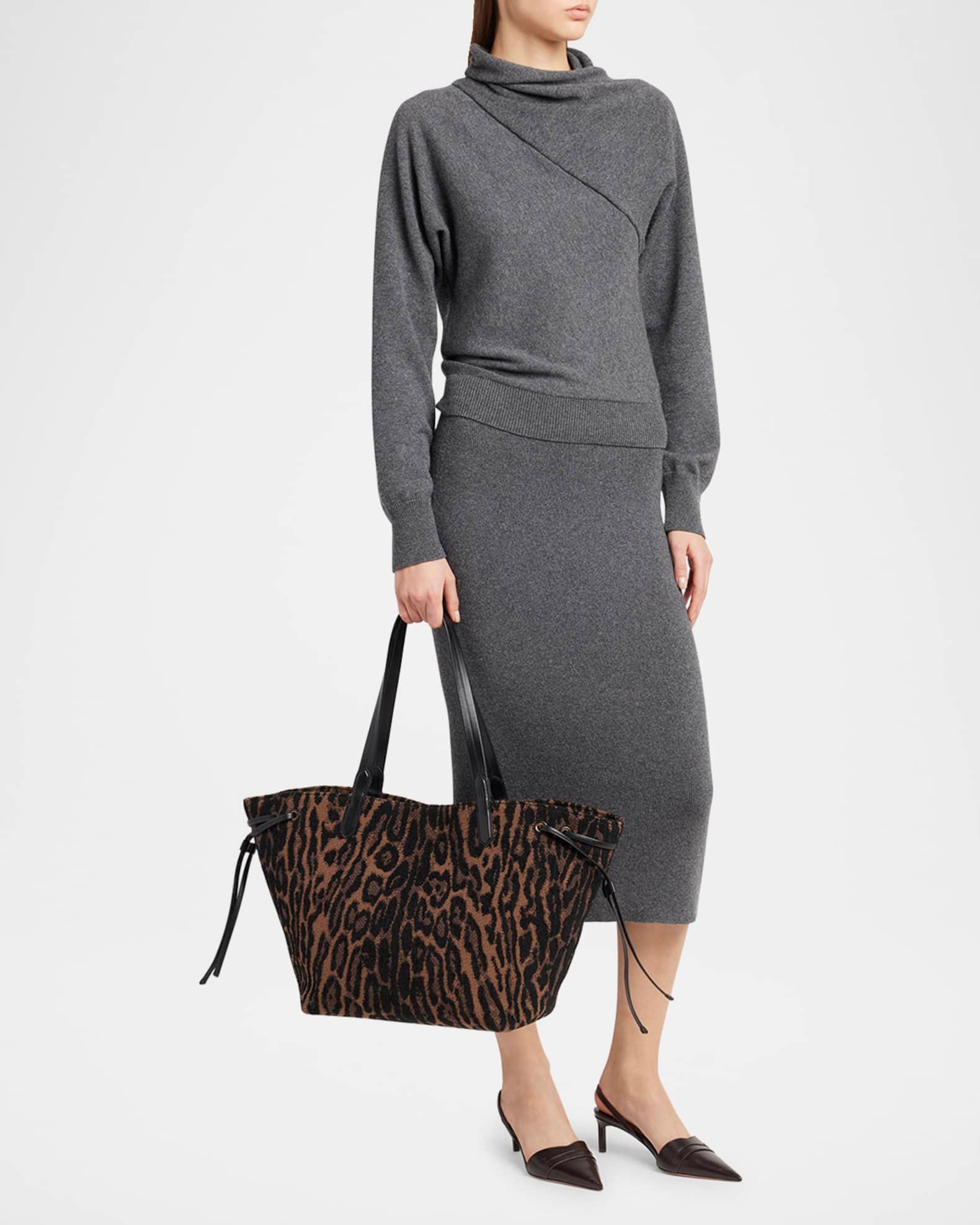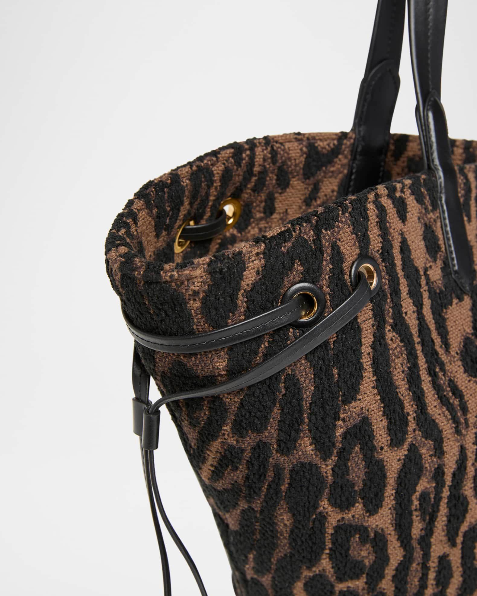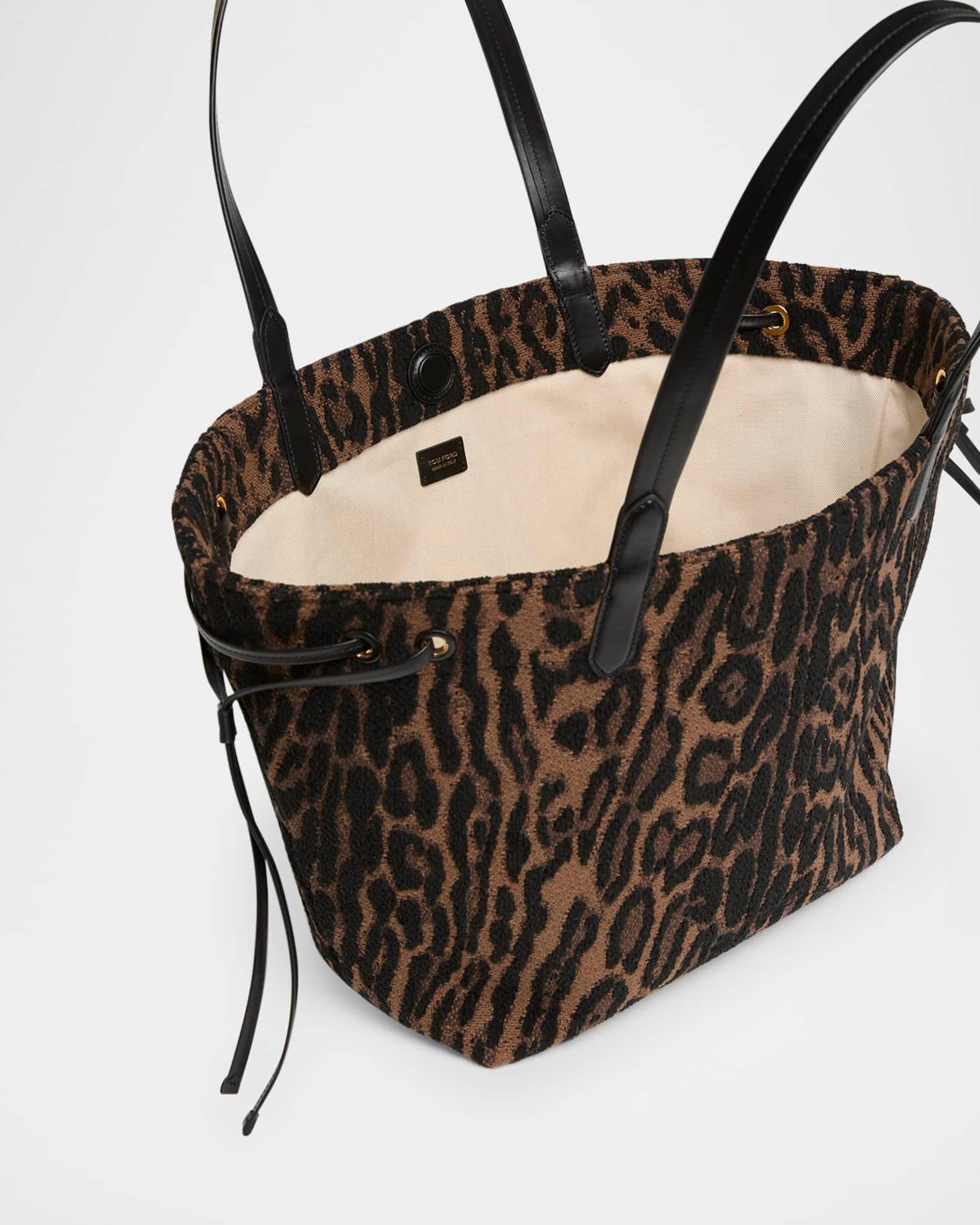 TOM FORD large tote bag crafted in woven ocelot jacquard with smooth calfskin leather details Leather top handles Open top with magnetic closures Side-cinching drawstrings Lining: Cotton Trim: Leather Approx. 11.4"H x 11.8"W x 6.3"D Item Weight (Lbs.): 1.1 Made in Italy