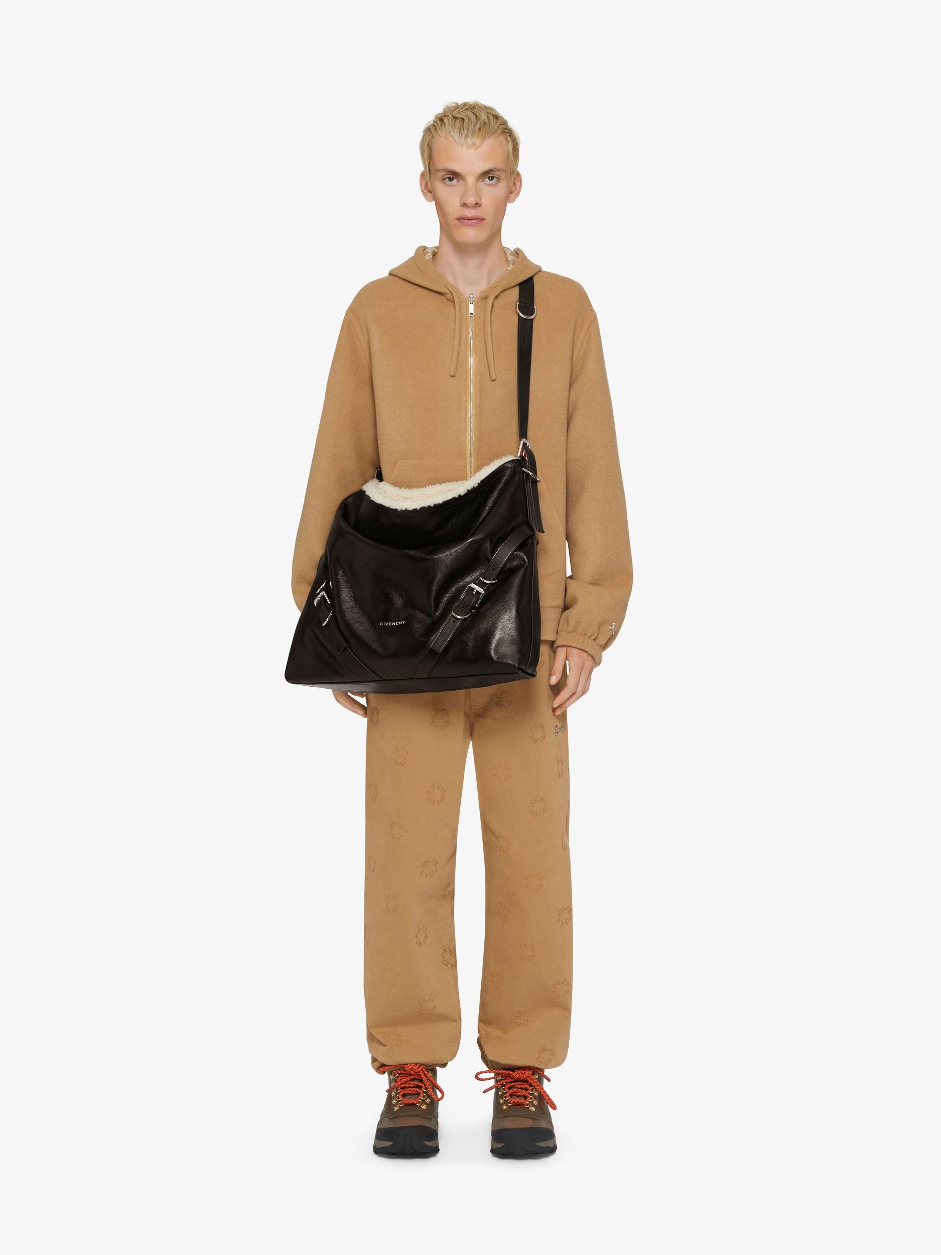 Large crossbody bag in leather and curly shearling. Voyou line. V-shaped slouchy silhouette. Adjustable shoulder strap offering crossbody or shoulder carrying. GIVENCHY signature embossed on the front of the bag and on the top of the shoulder strap. GIVENCHY engraved metal sliding buckles to adjust the volume of the bag. Silvery-finish metal details. One main compartment. One inside zipped pocket. Cotton lining.
