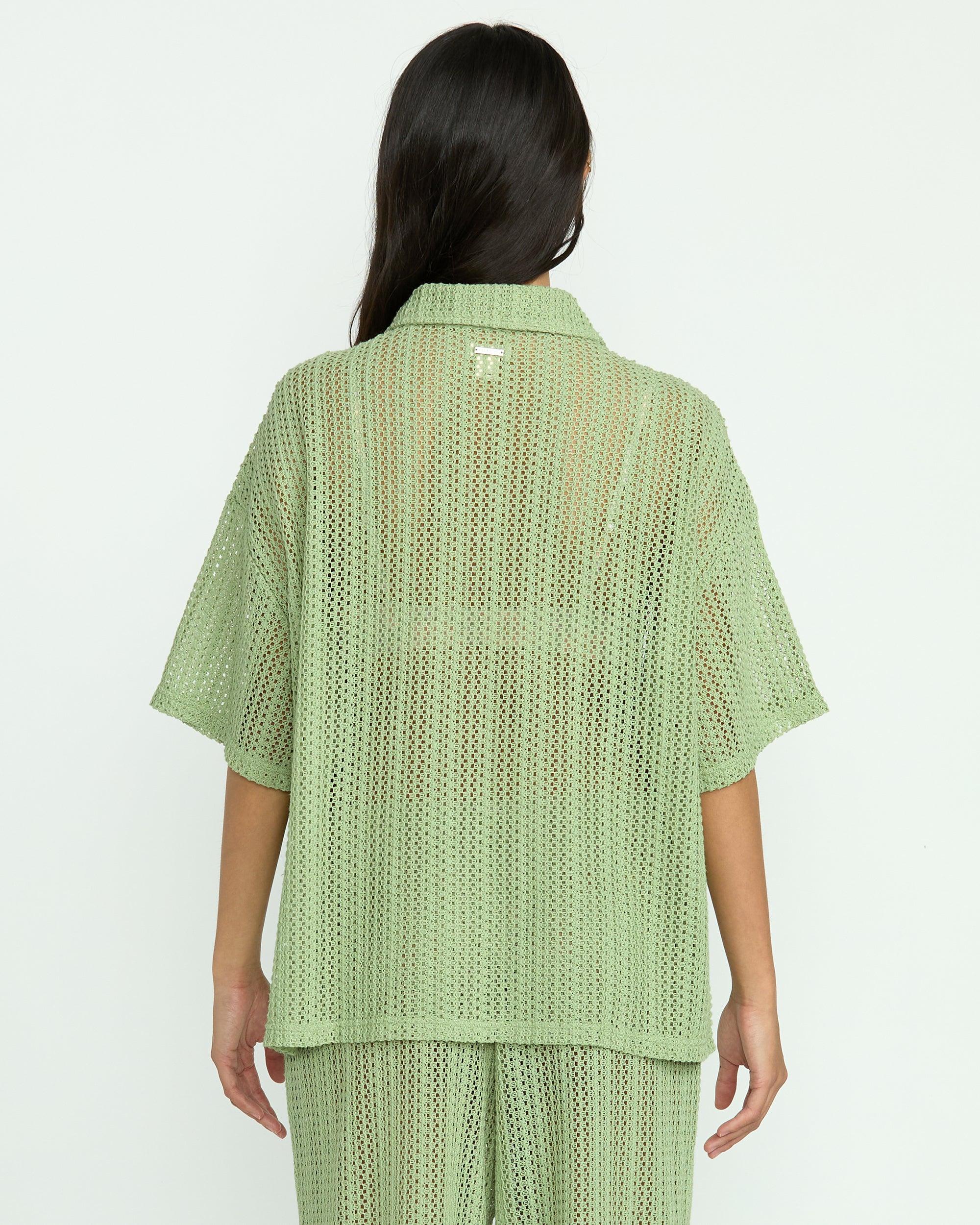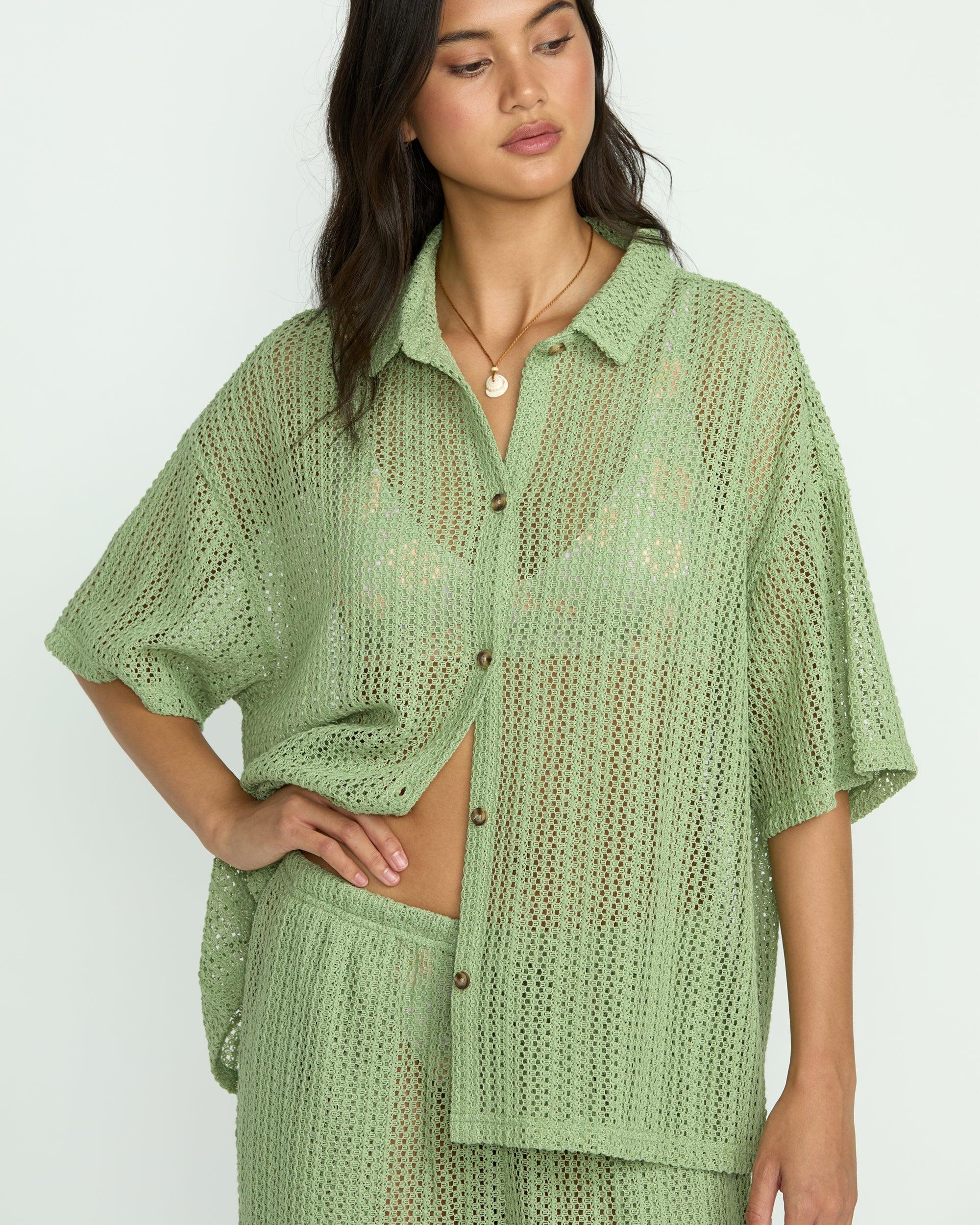 A knit top blending comfort and style. Faux crochet textures pair with a relaxed fit for laidback ease. Button placket and metal plate add borrowed-from-the-boyfriend appeal. Crafted from an ultra-soft polyester/cotton blend. Featured here in the Misc colorway. Features Knit top 65% Polyester 35% Cotton Faux Crochet Relaxed fit Front button placket Metal plate