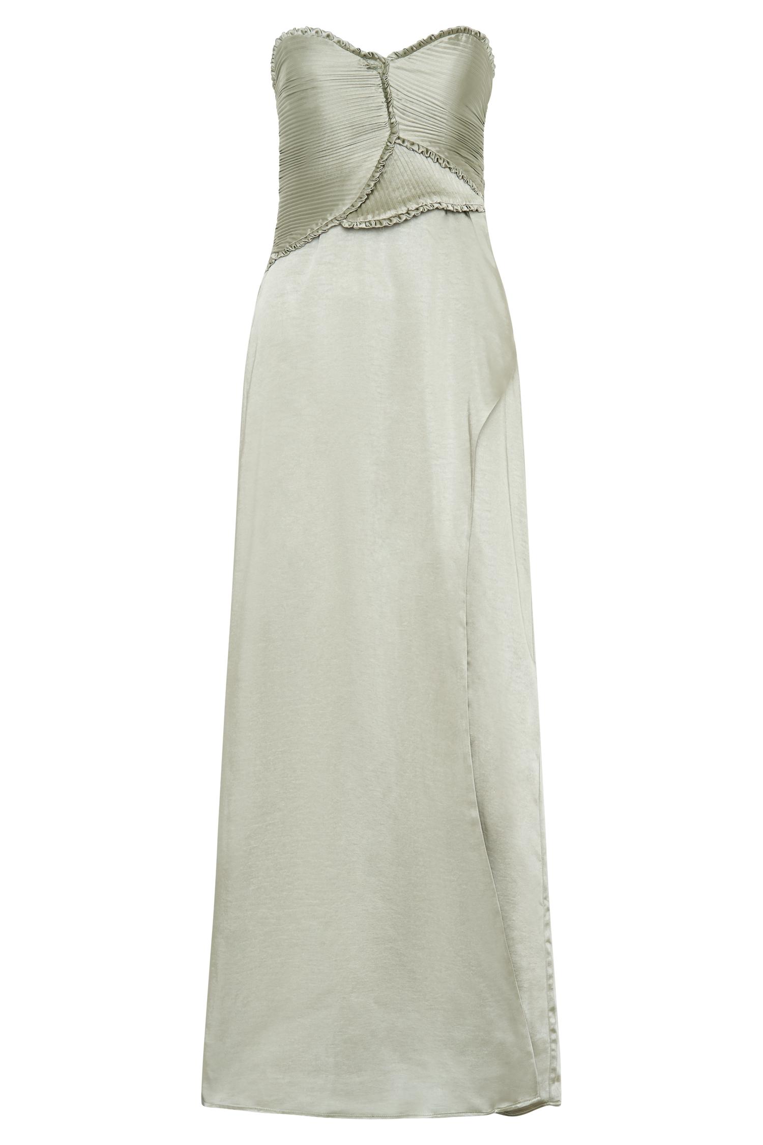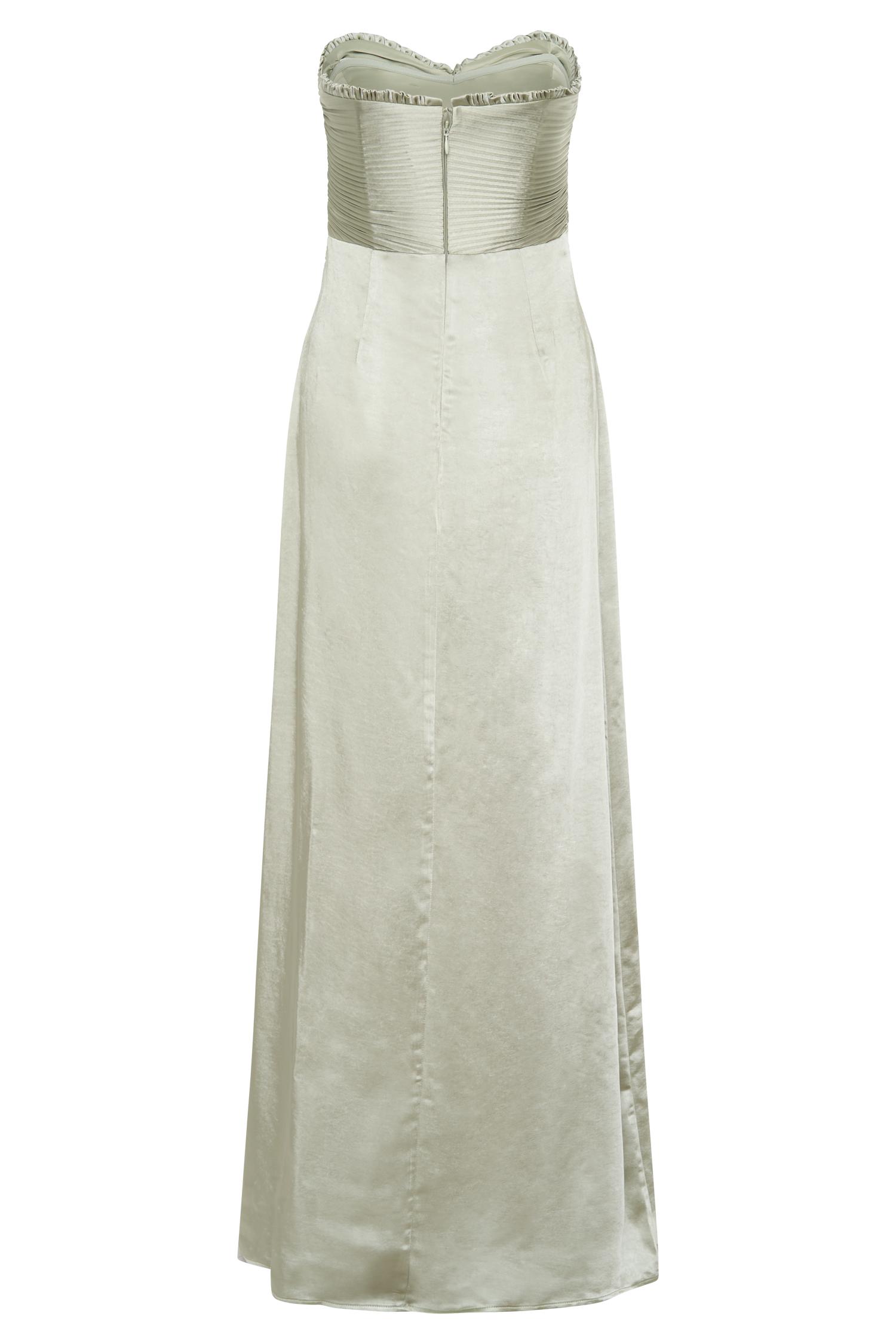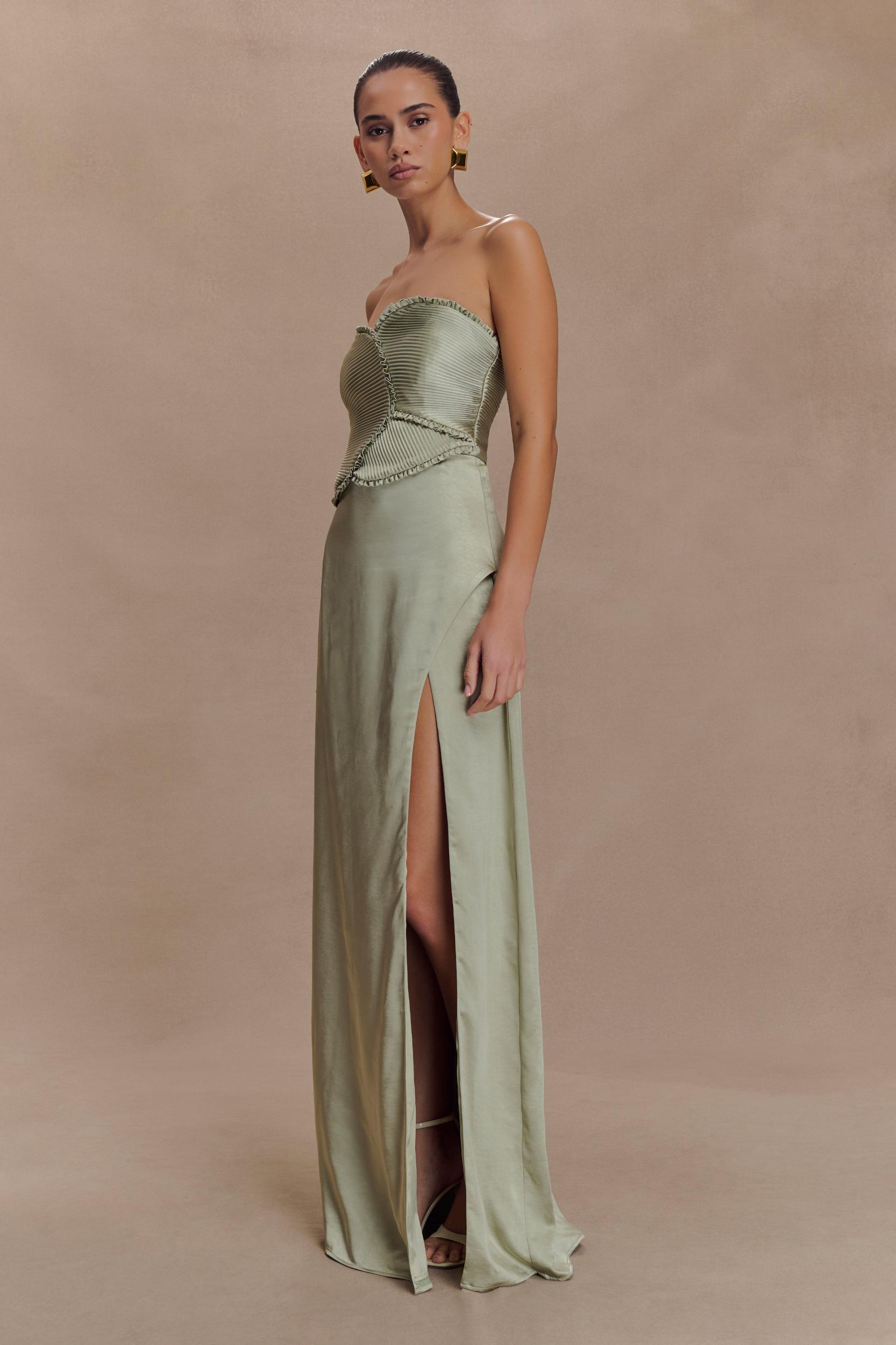 Please be advised this style runs small and fabric does not allow stretch. Refined beauty. The LARISSA Satin Maxi Dress with Ruched Petals is a breathtaking piece designed to make a statement. Featuring a flattering strapless neckline, this dress showcases rounded pleated panelling details on the bodice, adding a touch of sophistication and texture. The centre back zip closure ensures a secure fit, while the straight skirt shape creates a sleek silhouette. A daring front leg split adds an element of allure, perfect for showing off your favourite heels. Lined for comfort and a luxurious feel, this dress is your go-to choice for special occasions, ensuring you’ll turn heads wherever you go.