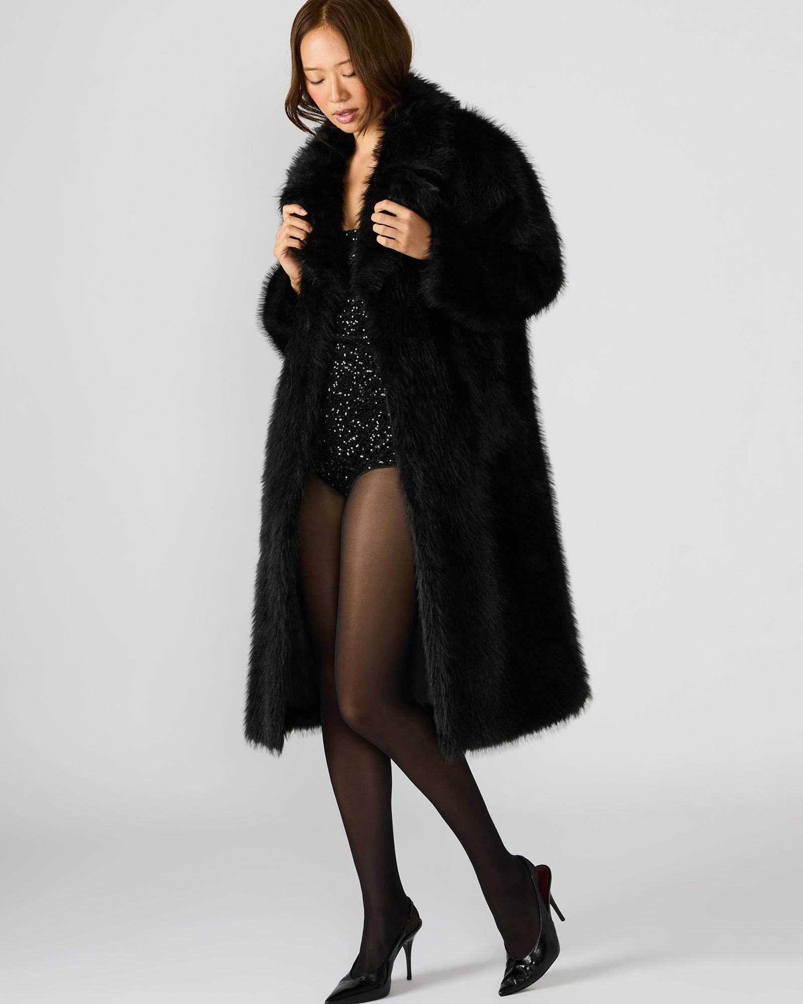 The LARKIN COAT BLACK is an expertly crafted long-sleeved faux fur jacket designed to provide luxurious warmth and style. Its plush texture offers a sophisticated, comfy layer perfect for cooler days. This jacket combines fashion-forward appeal with animal-friendly materials, making it an ideal choice for those seeking elegance without compromise. Durable and easy to style, this coat elevates any wardrobe with both comfort and impeccable design. Long-sleeved coat Faux fur material Two functional front pockets 100% polyester Hand wash Michelle is 5ft 10in and is wearing a size small Imported