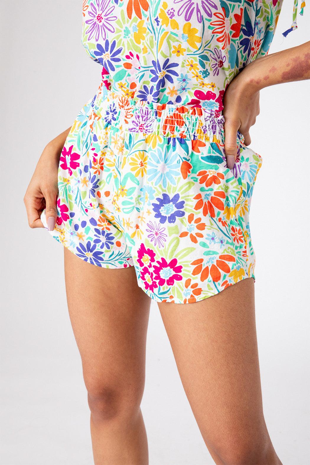 Bring a burst of playful energy to your wardrobe with the Larkspur Sophie Shorts. Crafted in breathable cotton with a vivid allover floral print, these high-rise shorts feature a softly elasticized waistband, drawstring tie, and relaxed silhouette for an easy, flattering fit. Whether you’re pairing them with the matching top or styling solo with a crisp white tee, they’re the go-to piece for sunny getaways, weekend markets, and warm weather lounging.