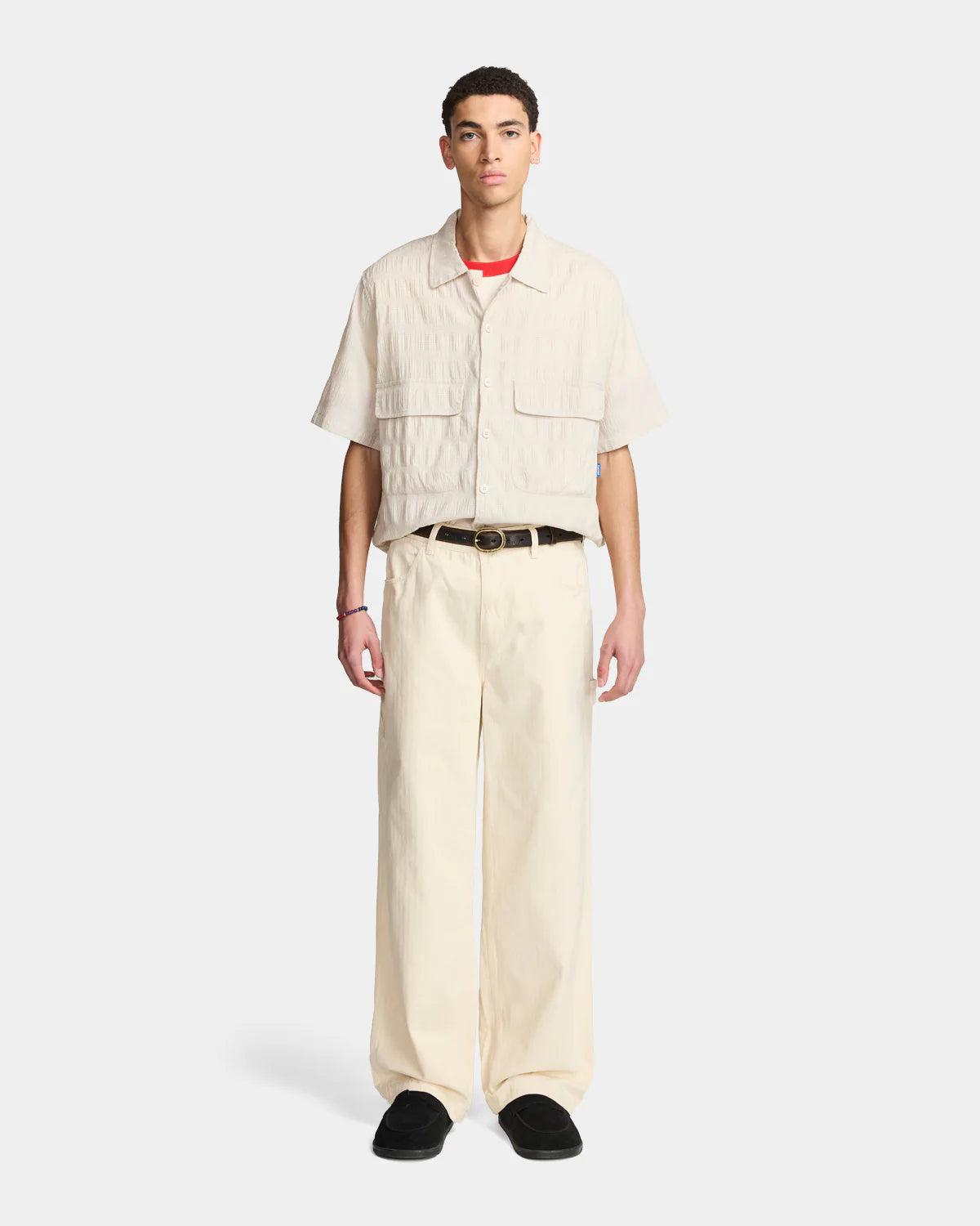 Unstructured boxy fit shirt with a flat collar.