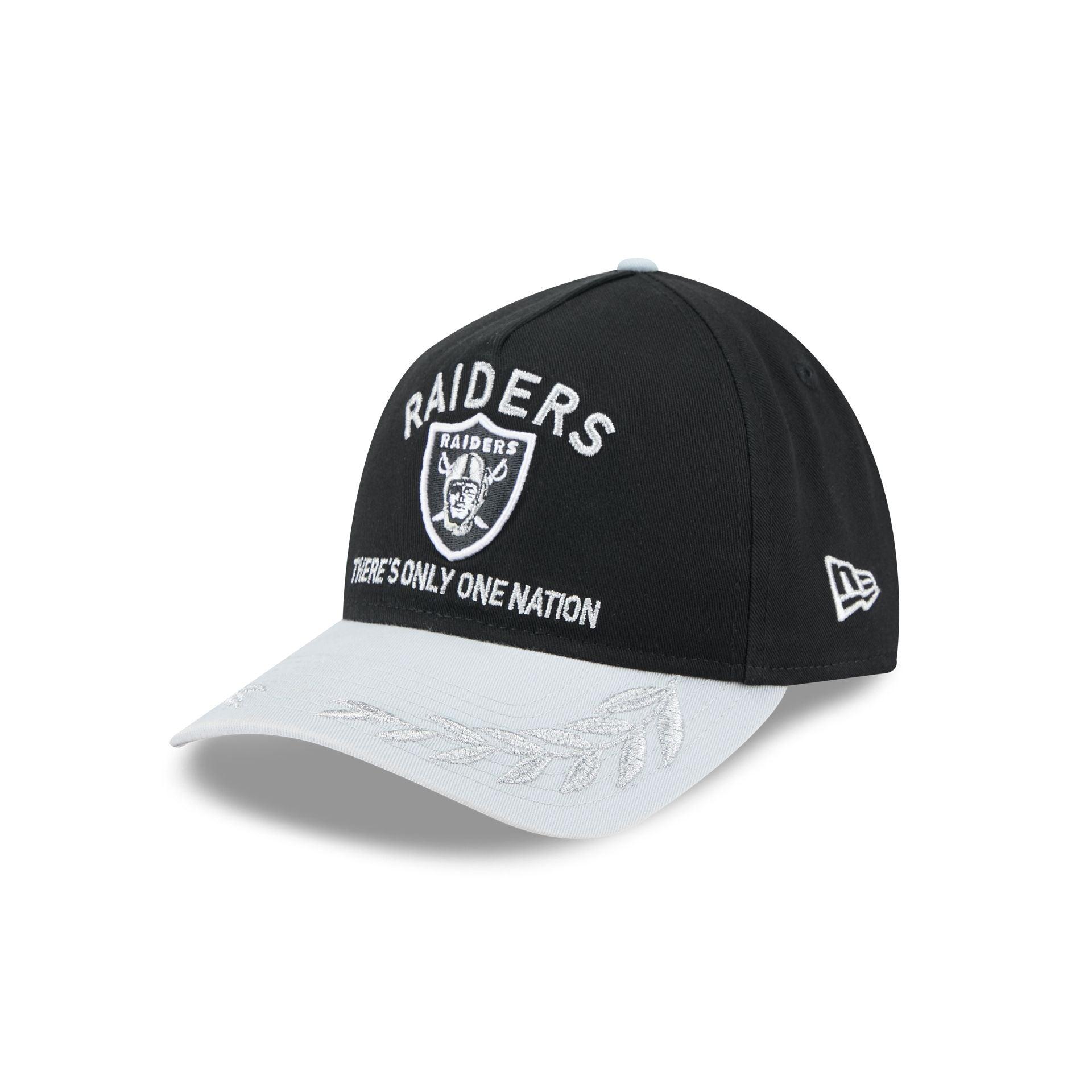 The Las Vegas Raiders 2025 Draft 9TWENTY A-Frame Adjustable Cap features an embroidered Raiders logo and wordmark at the front panels with an NFL Shield logo above an adjustable D-Ring closure at the rear. Additional details include ornamental stitched details at the visor and a gray undervisor.