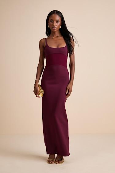 This dreamy dress will have everyone stopping, staring, and admiring every step you take. The crepe knit construction of this maxi knows exactly how to flatter any figure, along with a mesh panel that accentuates the waist. Slender straps, a structured square neckline, and a kick pleat at the back complete the look. Hidden side zipper/clasp.