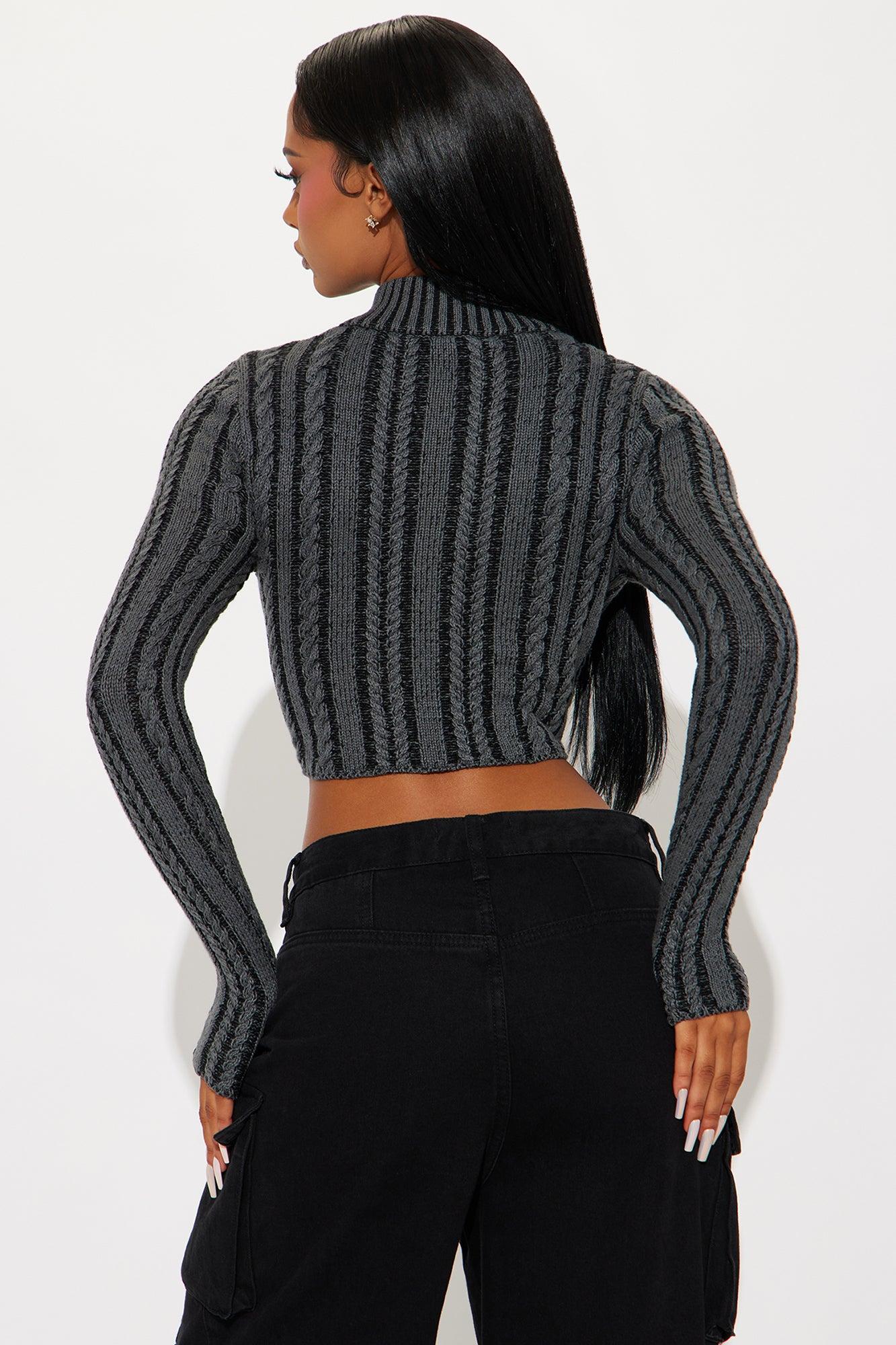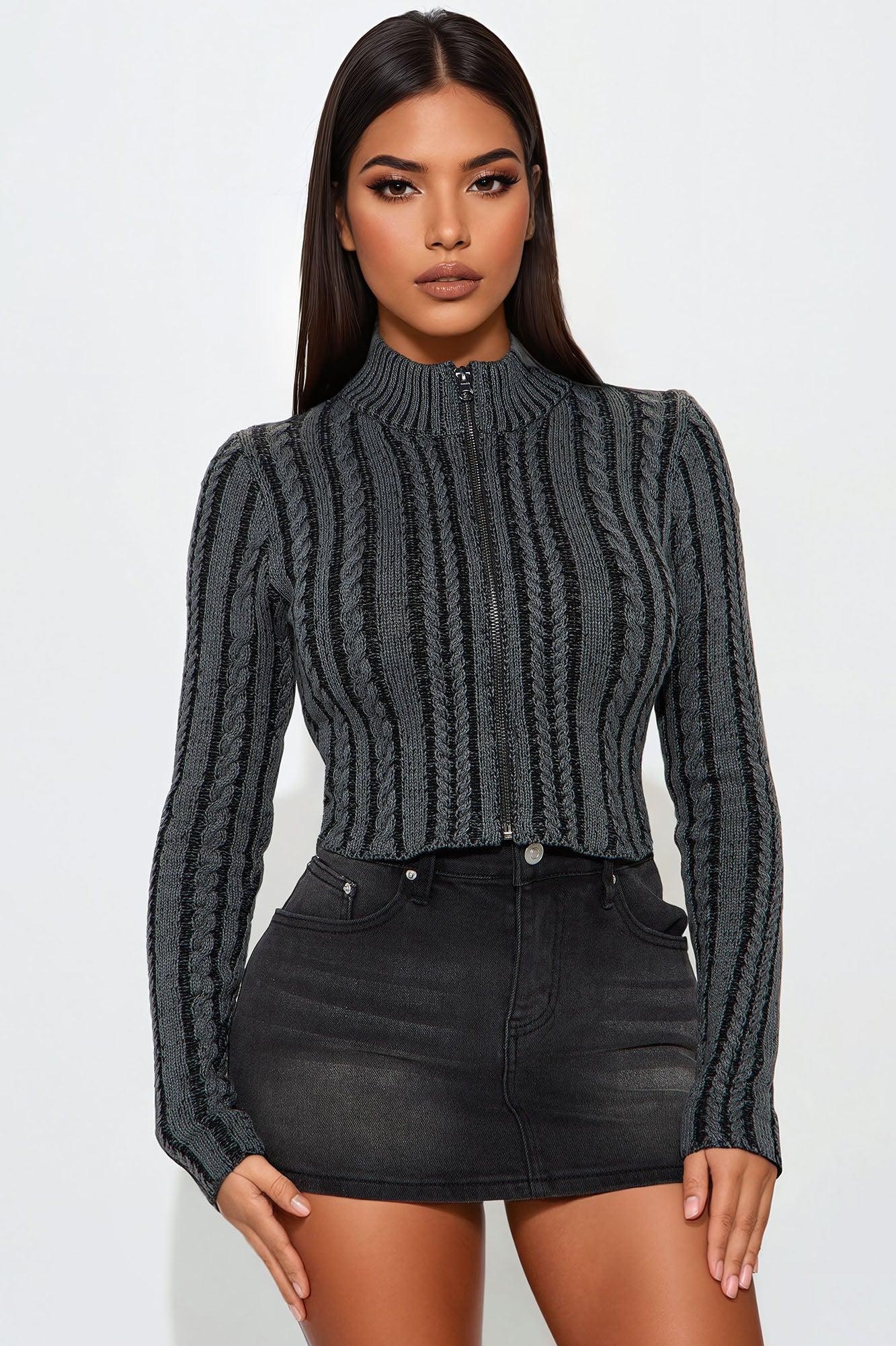 Available In Black/combo. Cardigan Sweater Cable Knit Long Sleeve Mock Neck Front Zipper Closure Cropped Ribbed Hem 60% Cotton 40% Acrylic Imported California Proposition 65 WARNING: Cancer and Reproductive Harm - www.P65Warnings.ca.gov.