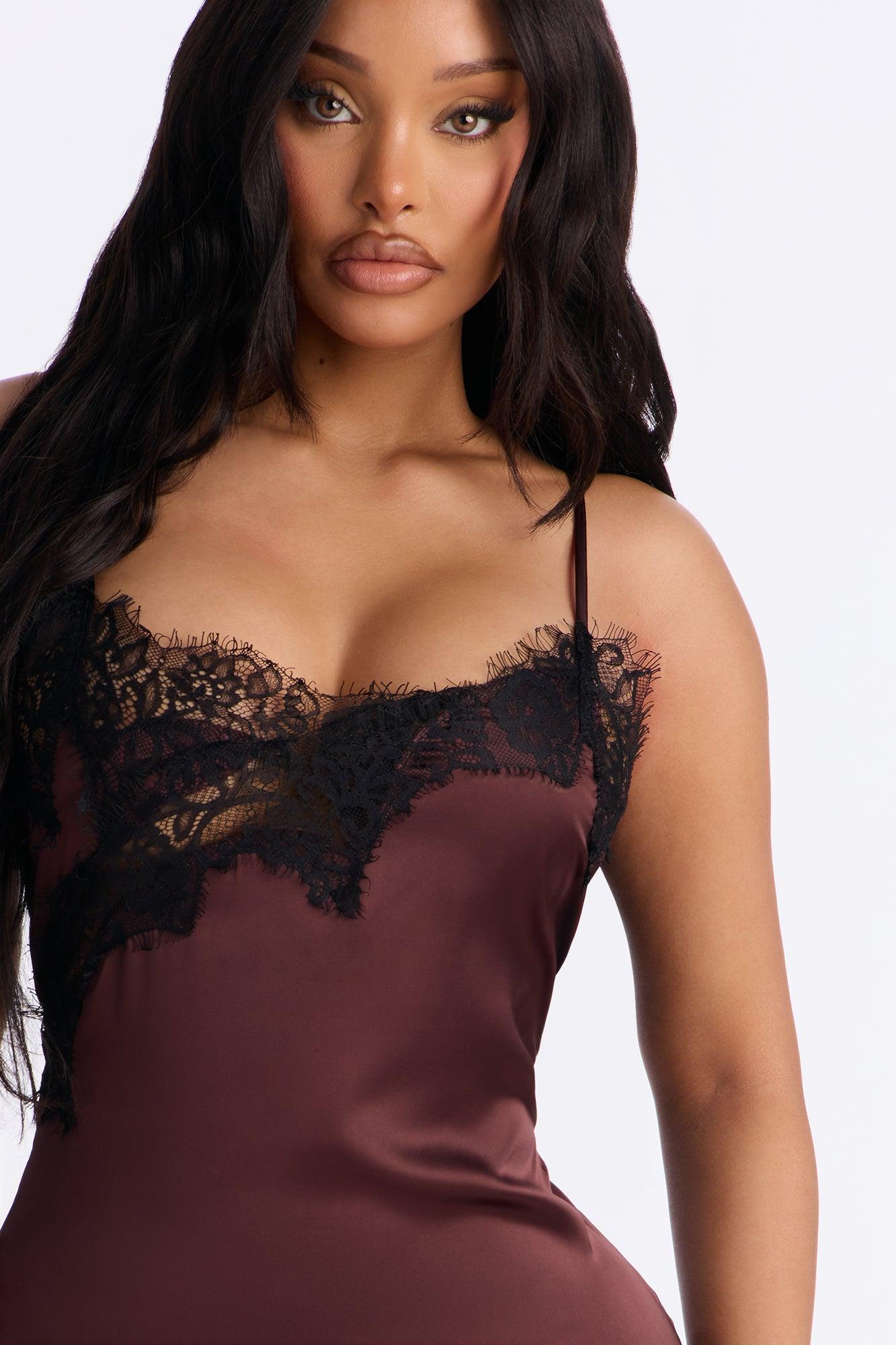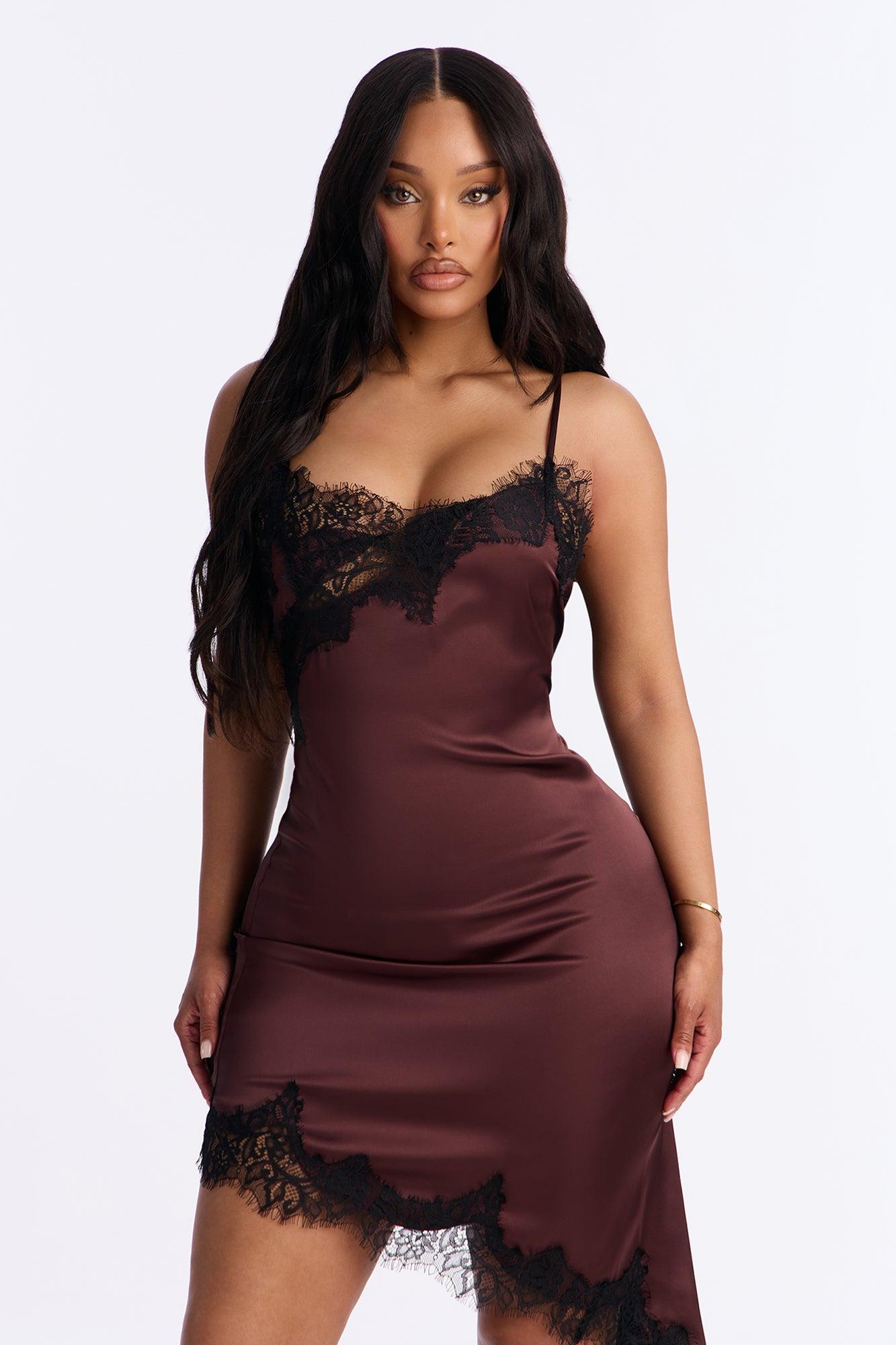 Available In Black And Chocolate. Satin Midi Dress Sweetheart Neckline Adjustable Spaghetti Straps Lace Trim Asymmetrical Hem Length Measured Flat = 34" Self: 95% Polyester 5% Spandex Contrast: 90% Nylon 10% Spandex Imported California Proposition 65WARNING: Cancer and Reproductive Harm - www.P65Warnings.ca.gov.