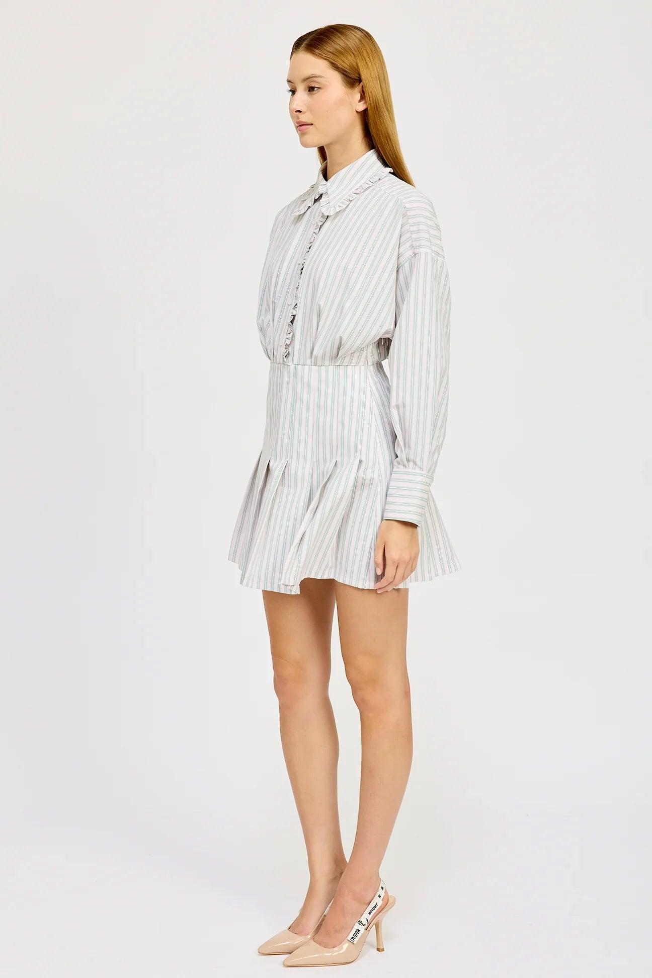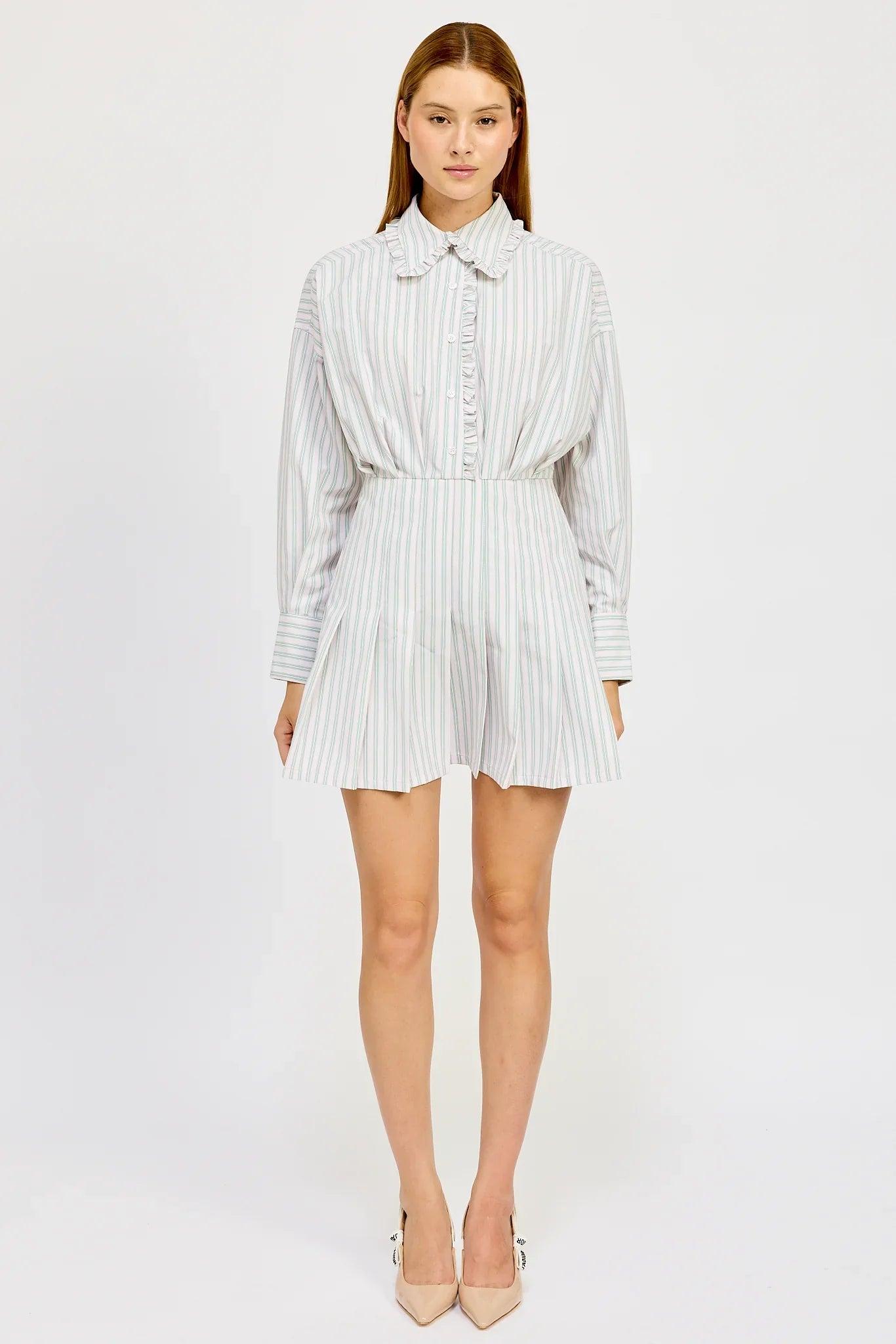 This green and pink striped dress is so cute with the ruffle Peter Pan collar and ruffle detail down the front.