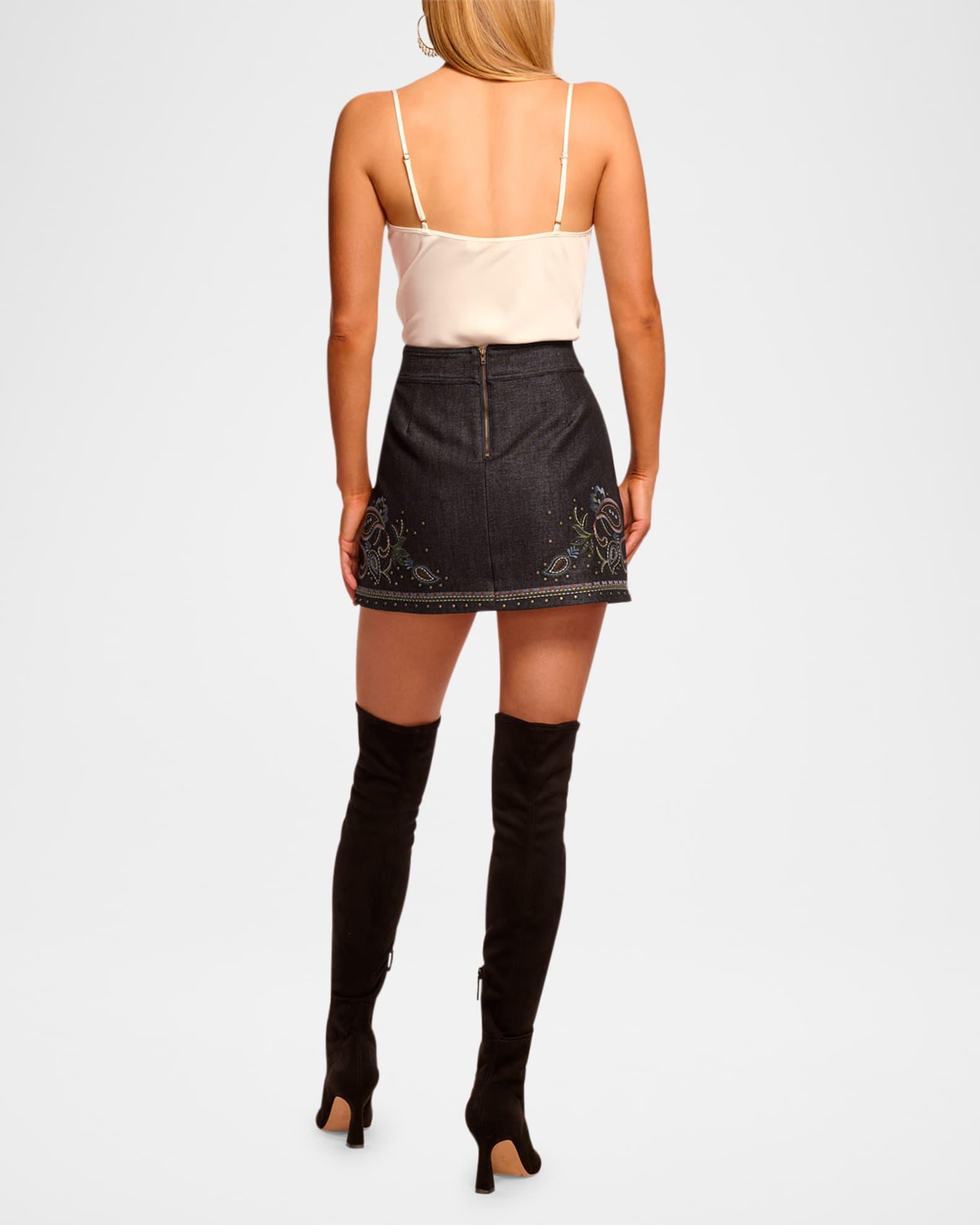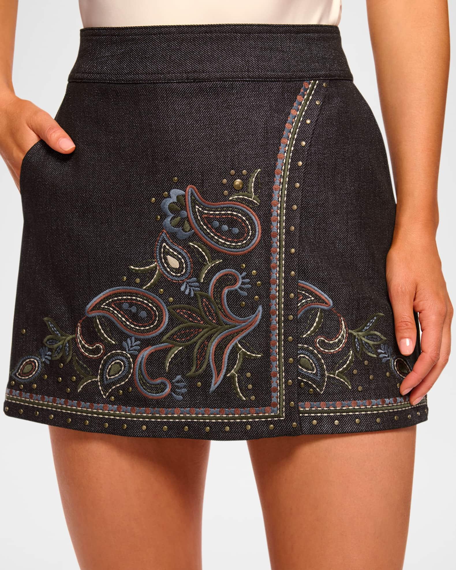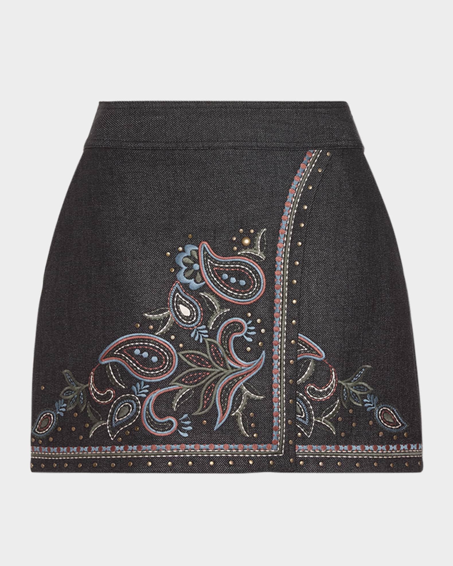 Crafted of dark-wash denim with fun embroidery, the Lauren skirt by Ramy Brook is finished with metal studding High waist Hem falls above the knee A-line silhouette Center back zipper Polyester/rayon/cellulose acetate/spandex Lining: Polyester/spandex Dry clean Imported