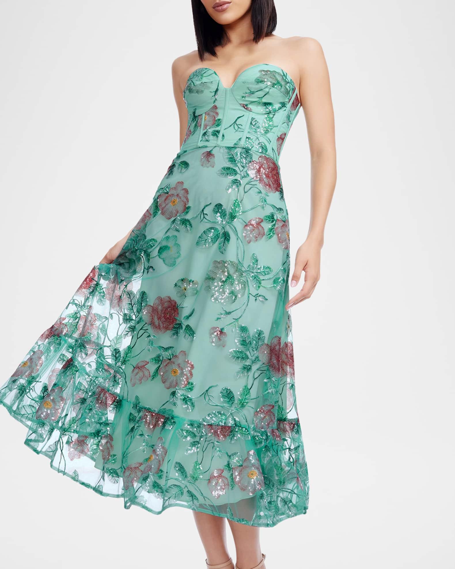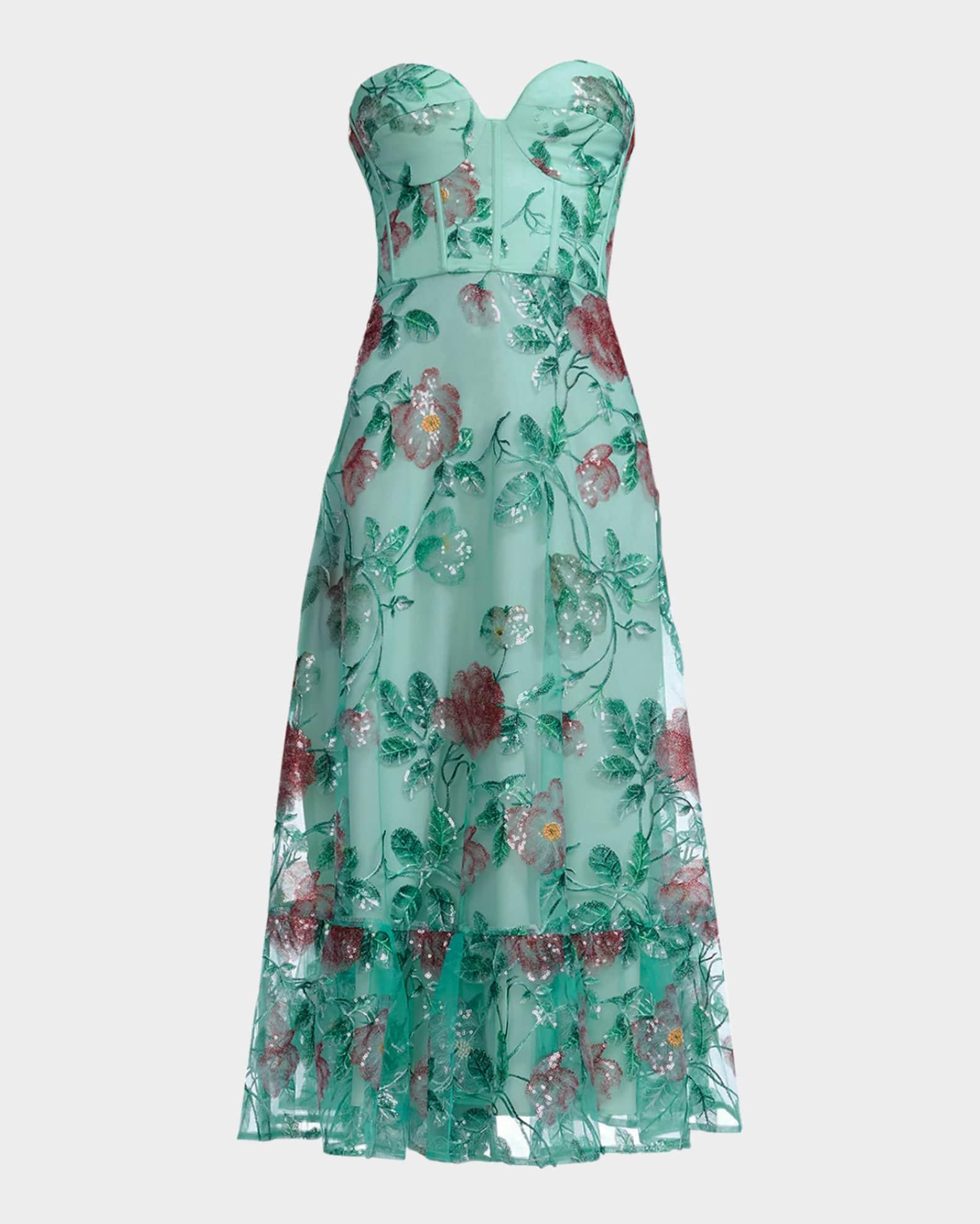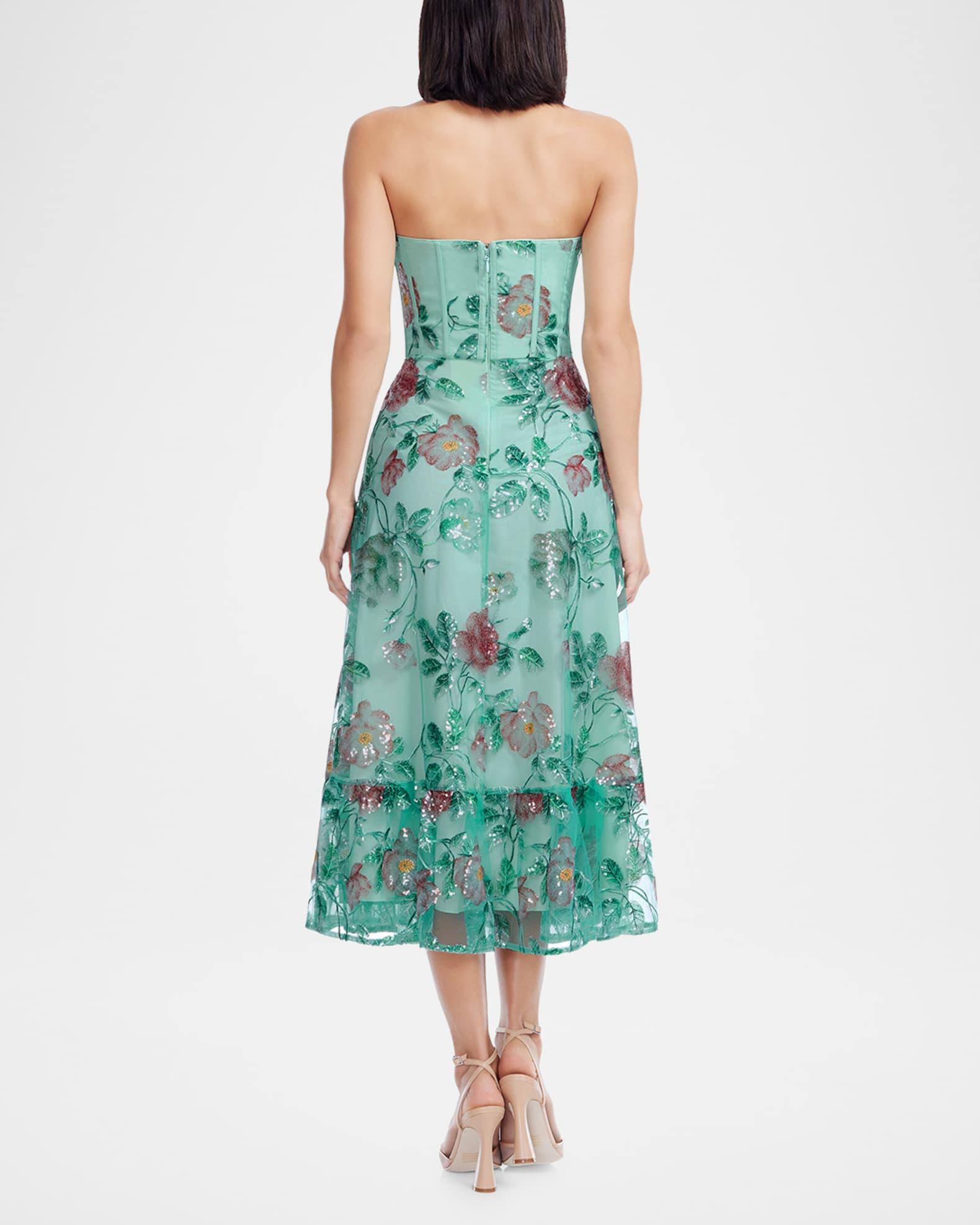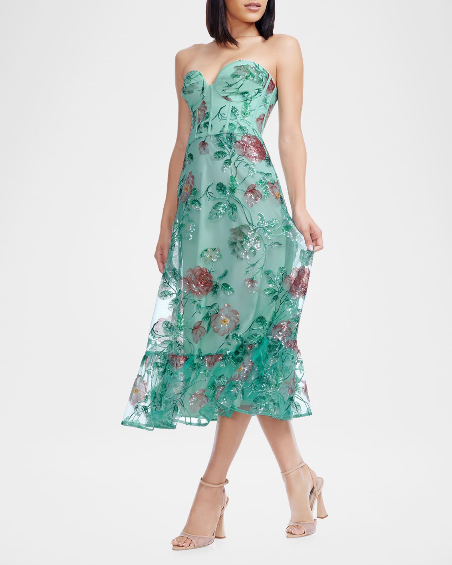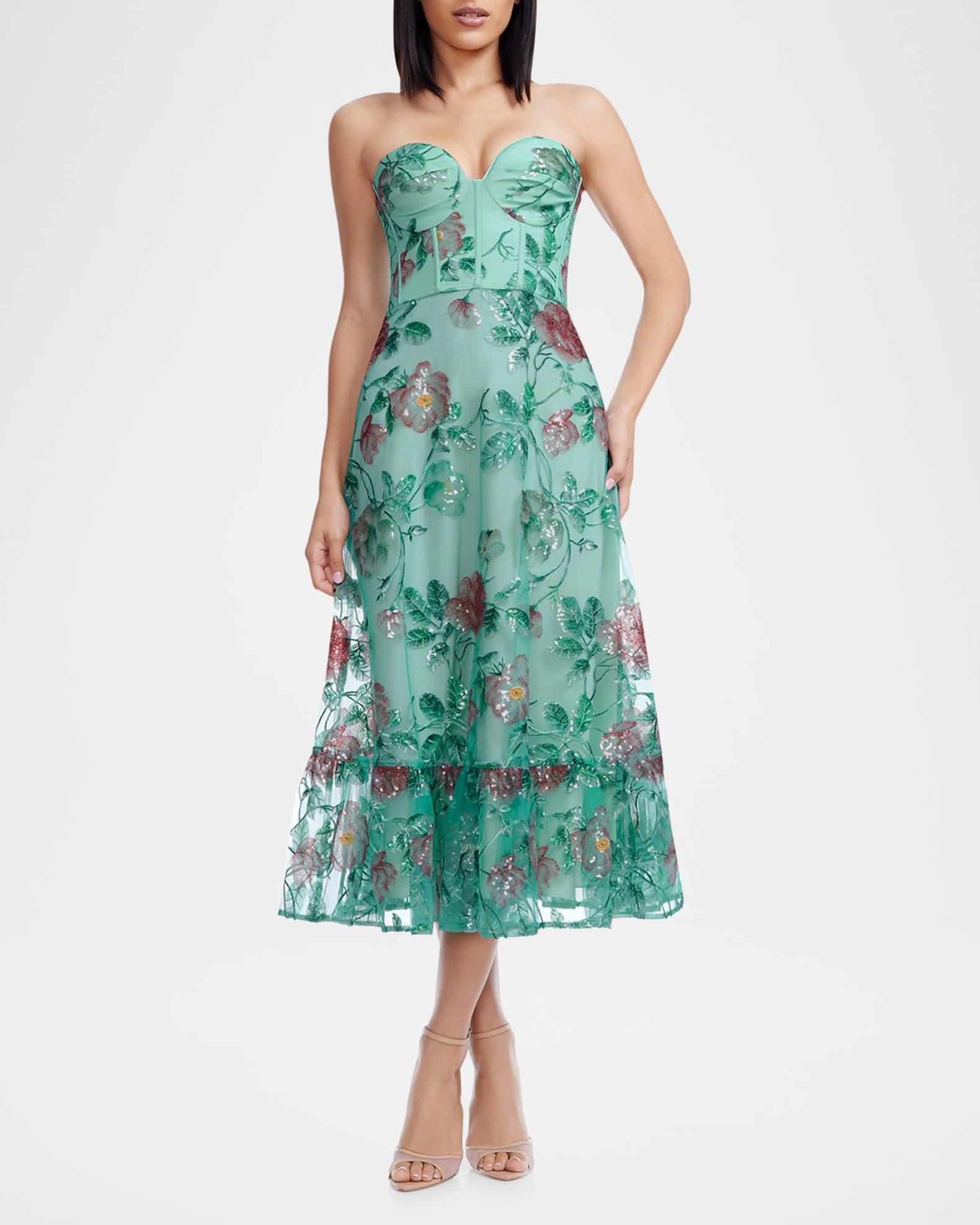 Romantic and playful, the Dress the Population Black Label "Lauren" corset midi dress shimmers with sequin florals Approx. 38"L from neckline to hem Strapless sweetheart neckline Sleeveless Flounce ruffle hem Hem falls below the knee A-line silhouette Invisible back zipper Polyester Fully lined Hand wash Imported