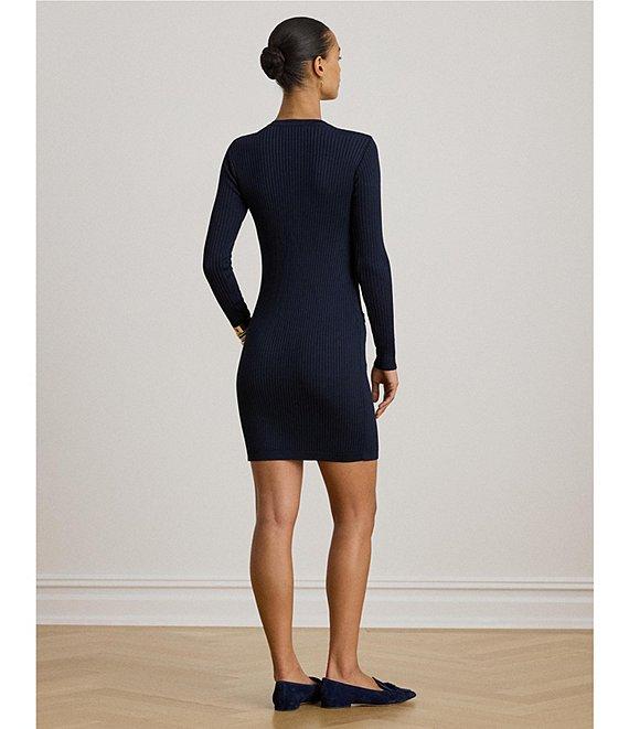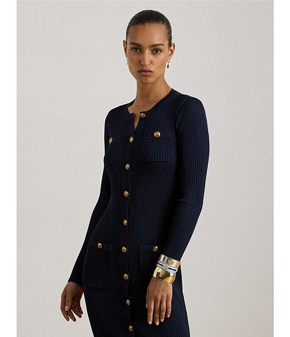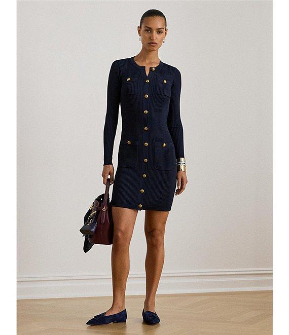 From Lauren Ralph Lauren, this dress features: Ribbed knit fabrication Sheath silhouette Round neckline Long sleeves Two chest and two waist buttoned pockets Slim fit Button down closure Approx. 34" length and 23" sleeve length Viscose/nylon Hand wash cold/flat dry or dry clean Imported.