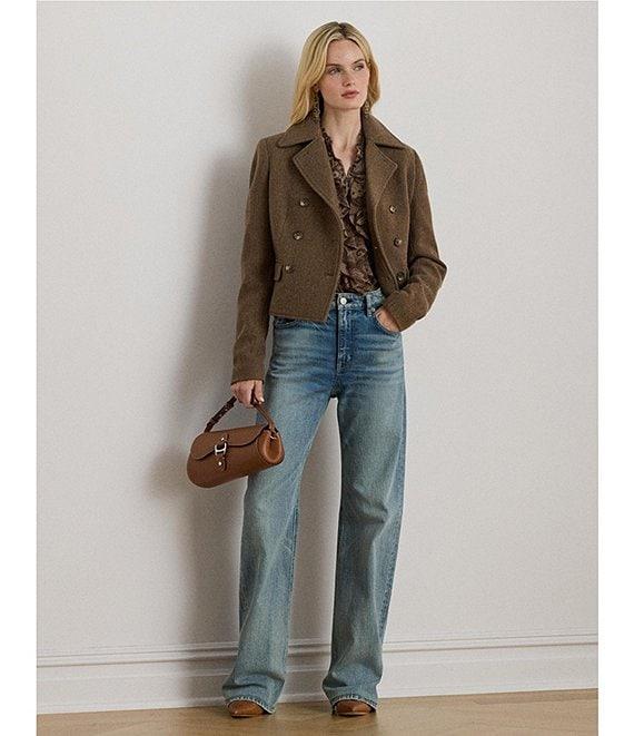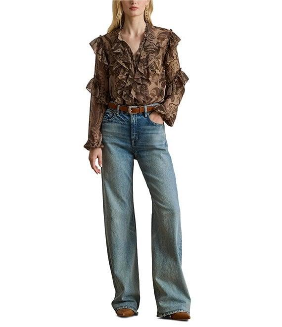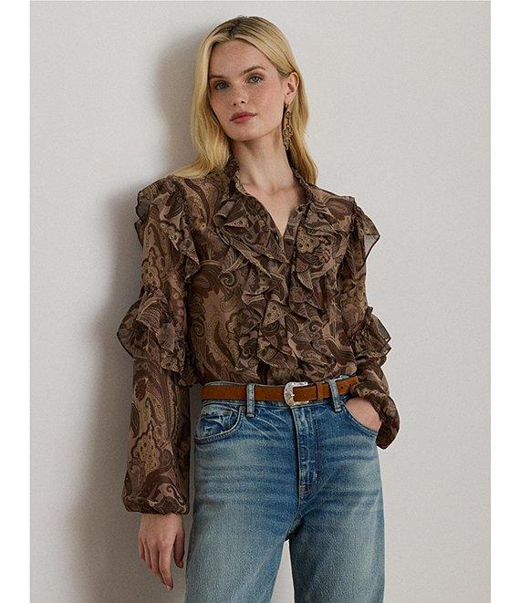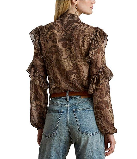 From Lauren Ralph Lauren, this blouse features: Chiffon fabrication Band collar Blouson long sleeves with elasticized cuffs Paisley print Ruffle trim at shoulders and sleeves Shirttail hemline Front partial button closure Approx. 25" body, 24.75" sleeve length Polyester Machine wash cold/line dry Imported.