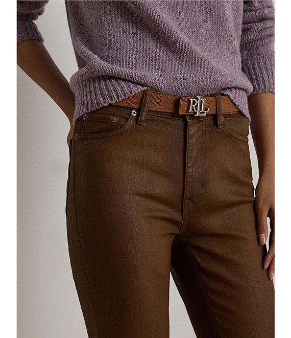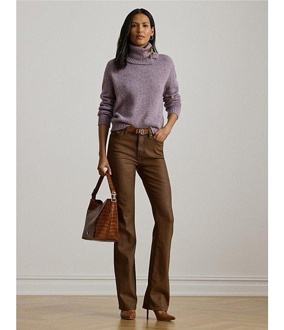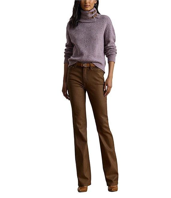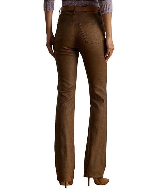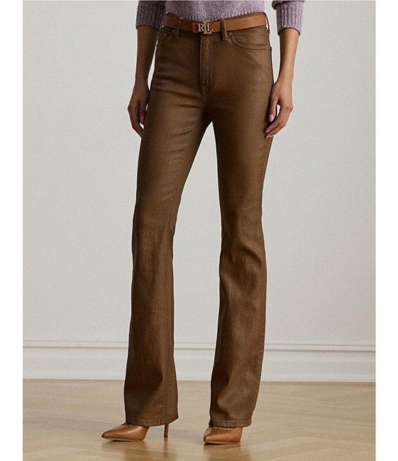 From Lauren Ralph Lauren, these jeans feature: Coated denim fabrication Bootcut leg silhouette High rise 5 pocket styling Belt loops Metal rivets with LRL logo Full length Front button and zipper closure Approx. 32.5" inseam, 17.5" leg opening, 11.25" rise Cotton/polyester/elastane Hand wash Imported.