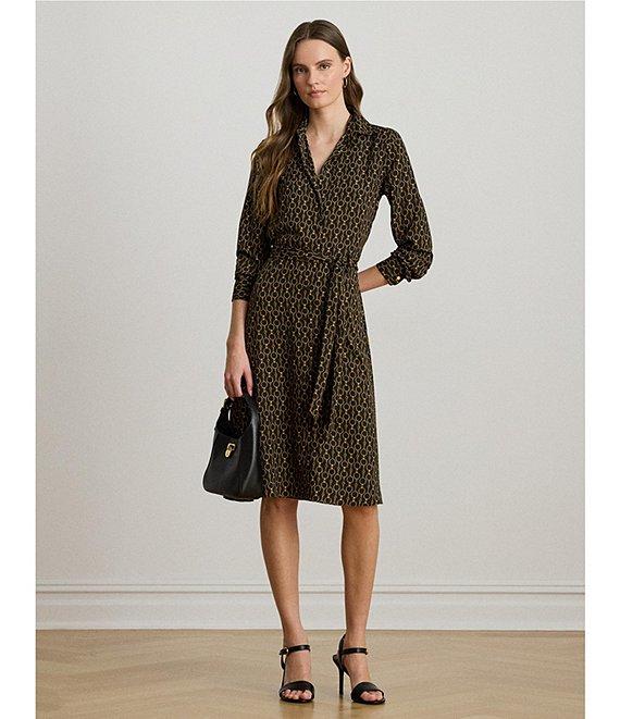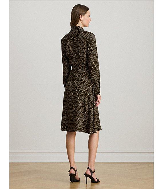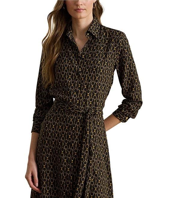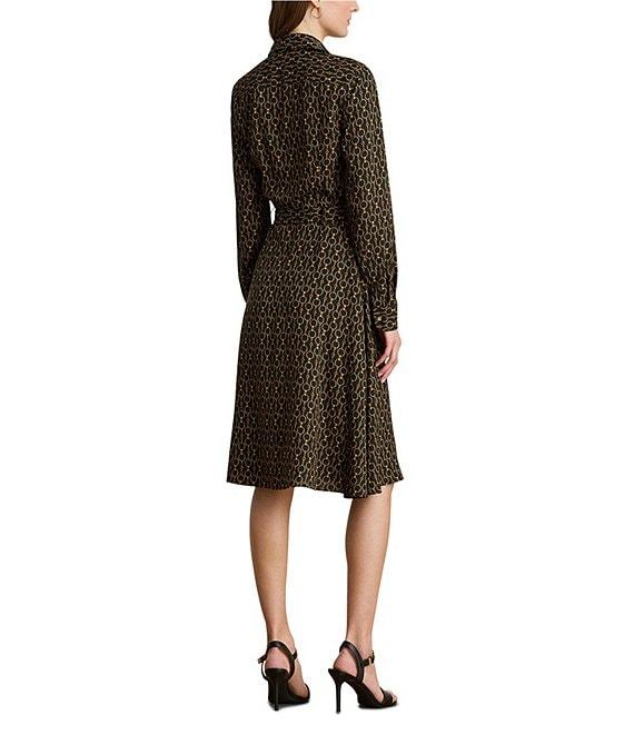 From Lauren Ralph Lauren, this dress features: Crepe fabrication Shirtdress silhouette Point collar Long sleeves with buttoned barrel cuffs Chain print LRL logo at collar and cuffs Belt loops Removable self-belt Back yoke and back body darts Front buttoned placket closure Approx. 42.5" body and 32.5" sleeve length, 0.5" between sizes Polyester Machine wash cold/line dry or dry clean Imported.