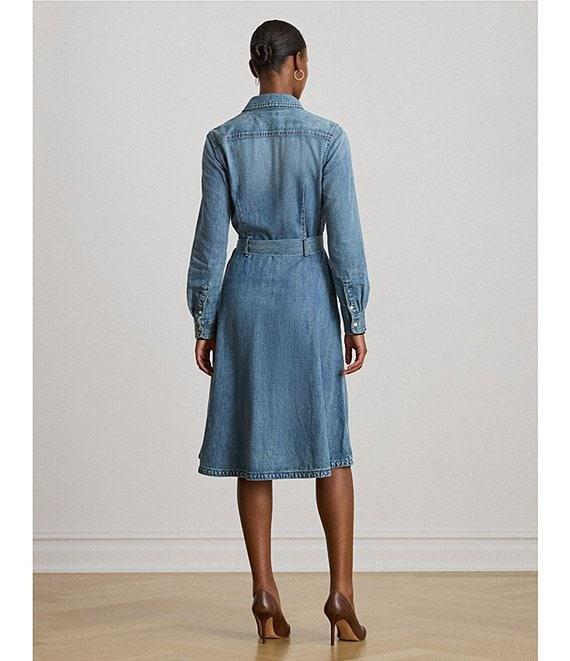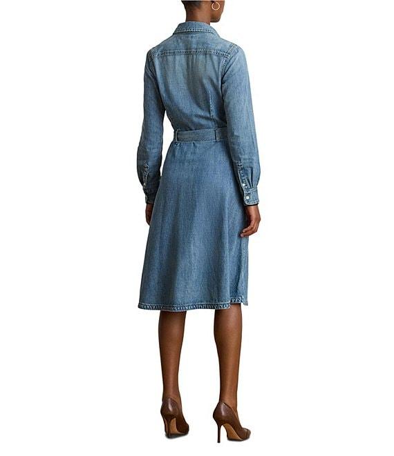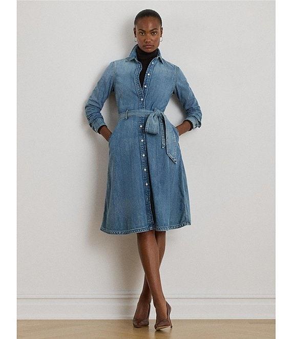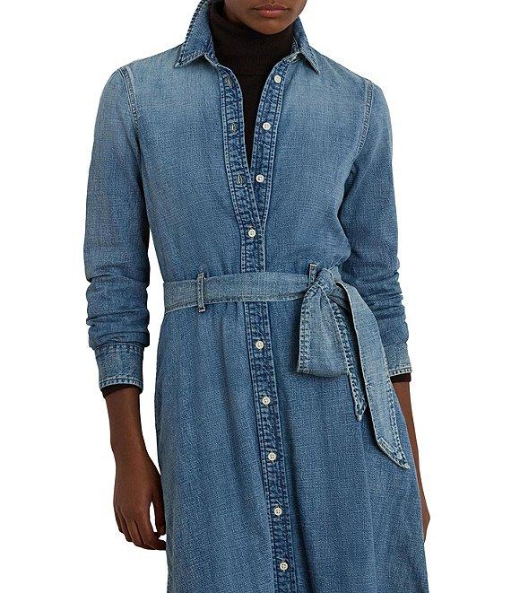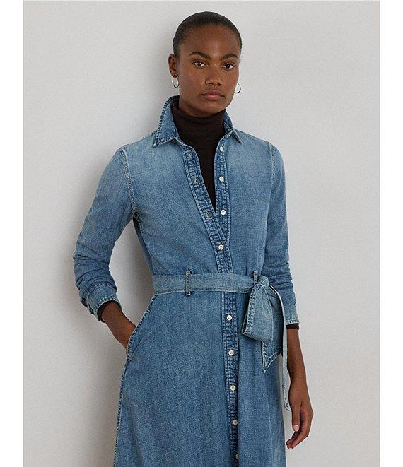 From Lauren Ralph Lauren, this dress features: Denim fabrication Shirt dress silhouette Point collar Long sleeves with buttoned barrel cuffs Belt loops Self fabric adjustable belt Side seam pockets Back waist darts Straight fit Front button placket closure Approx. 42.5 length, 32.75" sleeves, 0.25" between sizes Cotton Machine wash Imported.