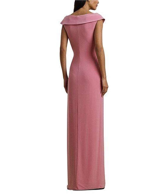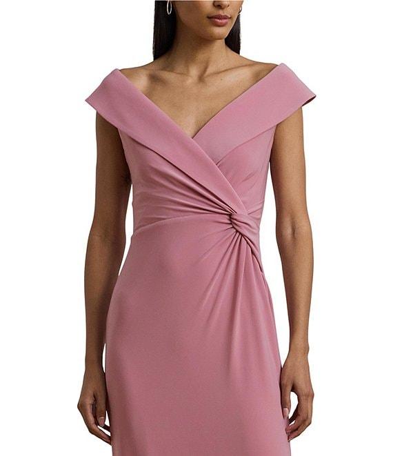 From Lauren Ralph Lauren, this dress features: Knit jersey fabrication Sheath silhouette Off-the-shoulder neckline Sleeveless Front twist detail Fully lined Pull on construction Approx. 58.5" length Polyester/elastane Machine wash Imported.