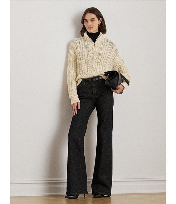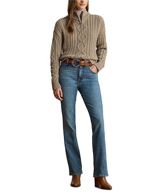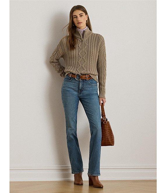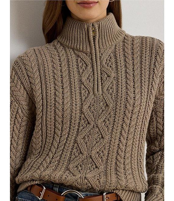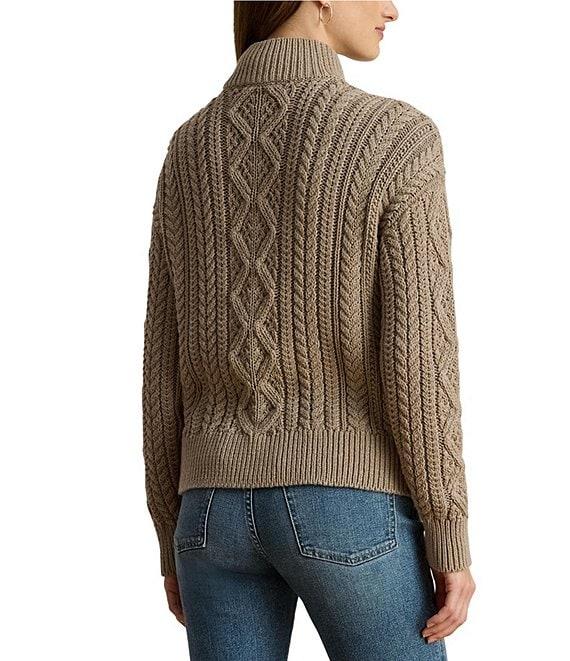 From Lauren Ralph Lauren, this sweater features: Cable knit fabrication Ribbed mock neckline Long sleeves with ribbed cuffs Dropped shoulders Ribbed hem Front quarter zipper closure Pullover construction Approx. 21.5" length; 19.25" sleeves Cotton Machine wash Imported.