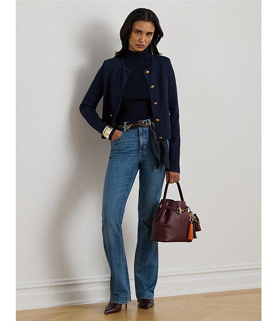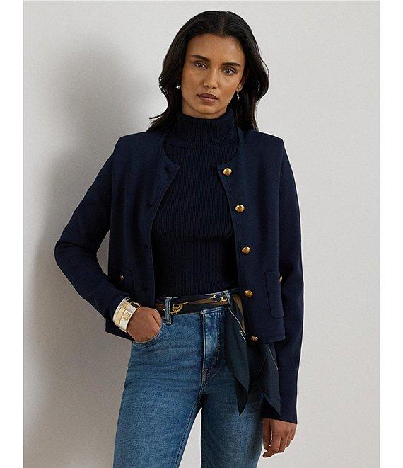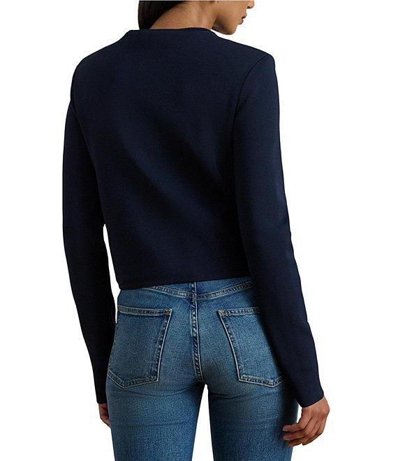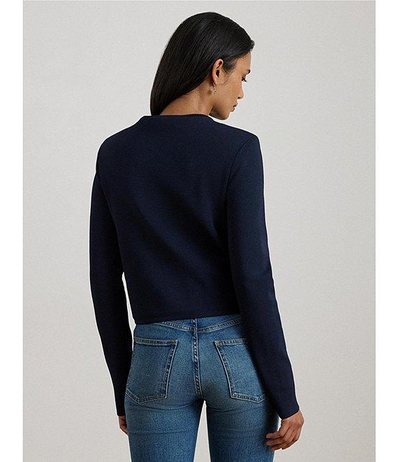 From Lauren Ralph Lauren, this sweater features: Knit fabrication Round neckline Long sleeves Two front patch pockets Cropped fit, intended to hit at the hip Straight hemline Button front closure LRL crest embossed buttons Approx. 19.5" length, 24" sleeve length, 0.5" between sizes Viscose/nylon Hand wash cold/flat dry or dry clean Imported.