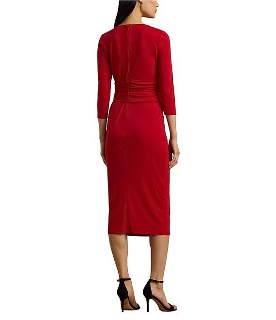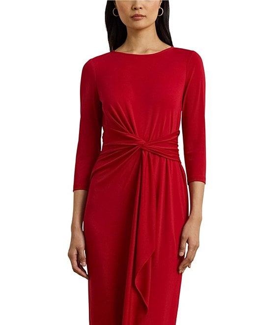 From Lauren Ralph Lauren, this dress features: Matte jersey fabrication Sheath silhouette Boat neckline 3/4 sleeves Front twist Cascading ruffle at waist Unlined Straight hemline Center back zipper closure Approx. 45" length Polyester/elastane Machine wash or dry clean Imported.