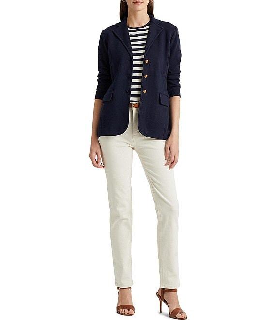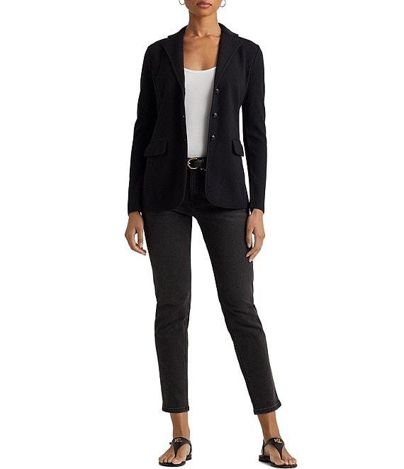 From Lauren Ralph Lauren, this blazer features: Notched lapel long sleeves with clean-finished cuffs flapped welt pockets at the waist princess seams at the front and the back clean-finished hem Three button front closure Approx. 27" length Combed cotton/nylon hand wash Imported. This must-have sweater blazer by Lauren Ralph Lauren is crafted from soft combed cotton and features princess seams that ensure a feminine fit.
