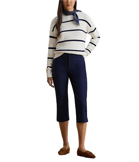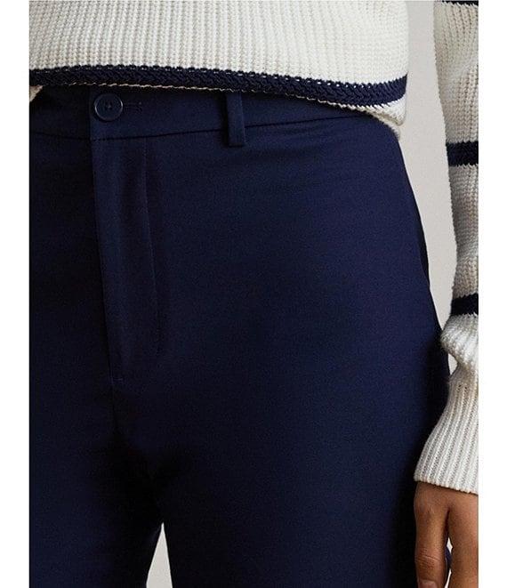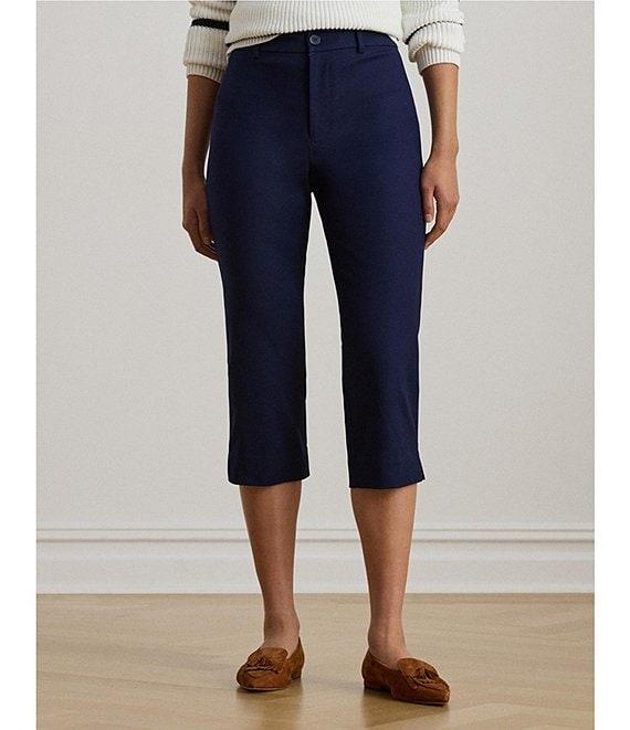 From Lauren Ralph Lauren Petite, these pants feature: Double-faced stretch cotton fabrication Straight leg Belt loop Back waist welt pockets Double back waist darts Intended to hit just below the knee Cropped length Cutaway detail at the hem Zip fly with a buttoned closure Approx. 11.25" rise and a 16" leg opening. All sizes have a 19.5" inseam Cotton/elastane Machine washable or dry clean Imported.