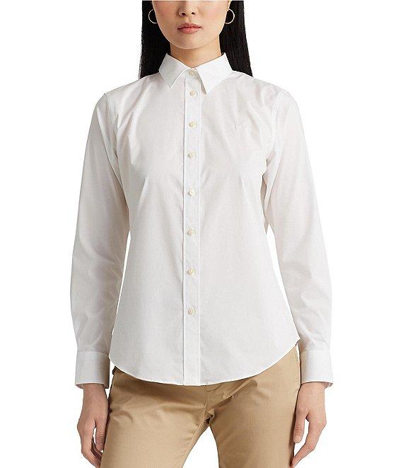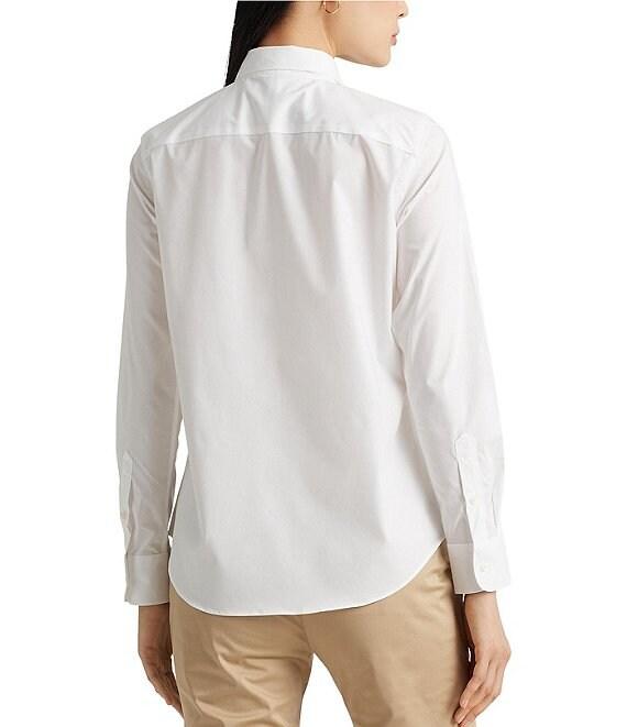 Treated with a no-iron finish, this classic shirt adorned with LRL embroidery is a wear-to-work must-have. From Lauren Ralph Lauren Petite, this shirt features: woven fabrication Point collar neckline Long sleeves with buttoned barrel cuffs Back yoke Signature "LRL" embroidery at the left chest Buttoned placket with signature "Lauren Ralph Lauren" buttons Shirttail hem button front closure Approx. 26" length Cotton/elastane Machine wash/tumble dry Imported.