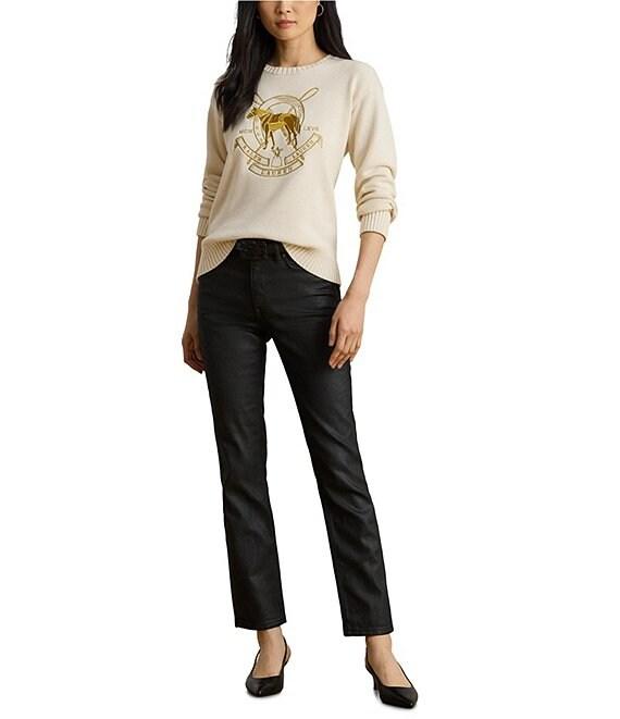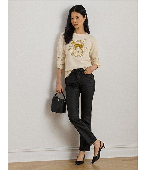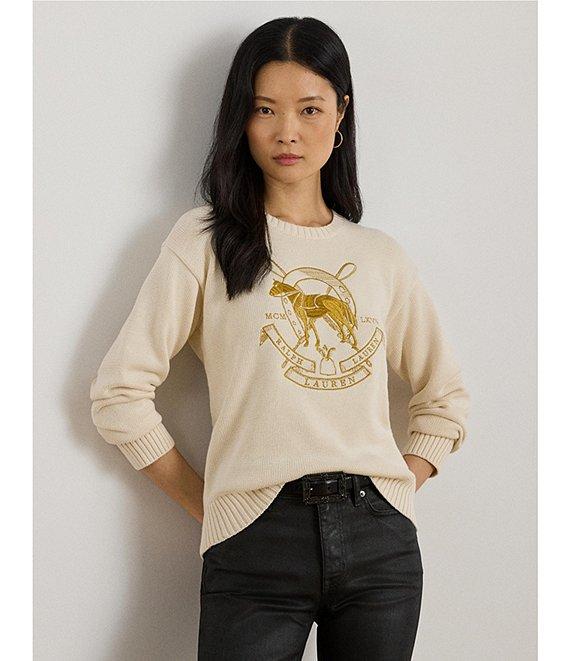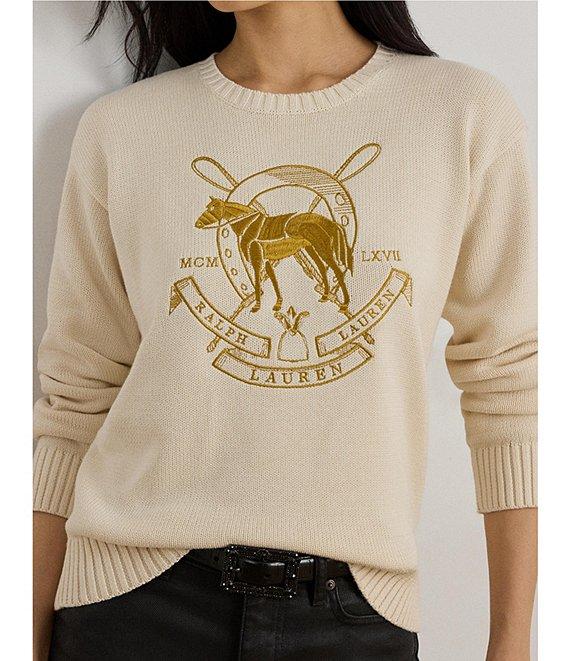 From Lauren Ralph Lauren Petite, this sweater features: Knit fabrication Embroidered horse motif on sweater front Ribbed crew neckline Long sleeves with ribbed cuffs Dropped shoulder Relaxed fit Intended to hit at the hip Ribbed hemline Pullover construction Approx. 21.5 body length, 19.5" sleeve length Cotton Machine washable or dry clean Imported.
