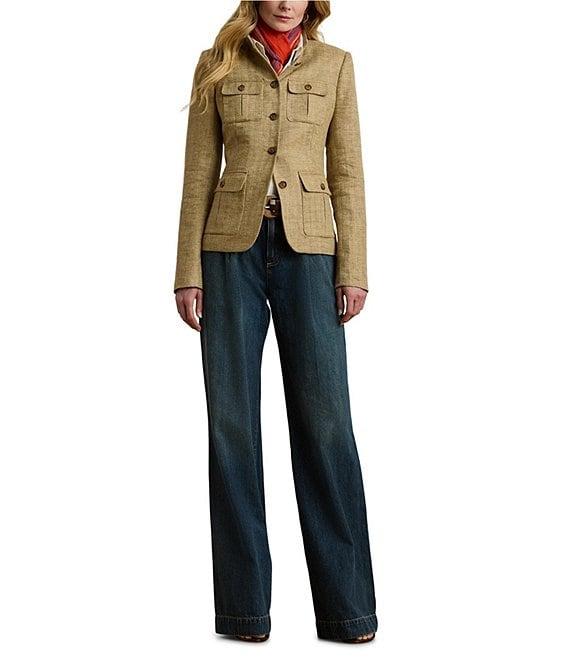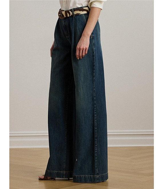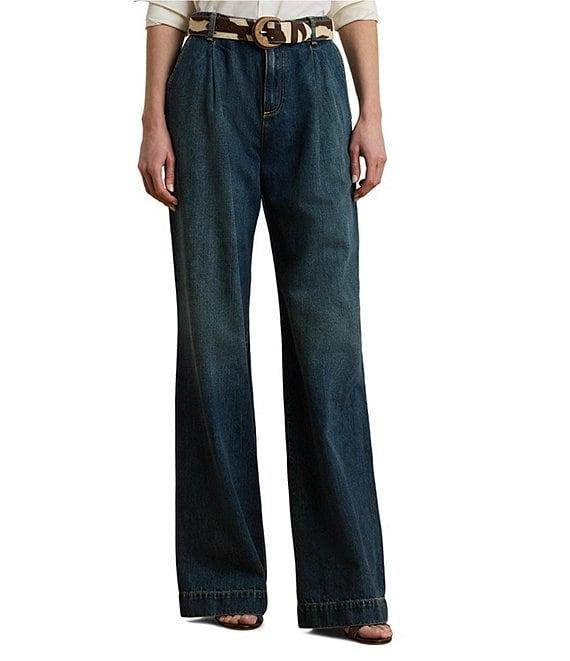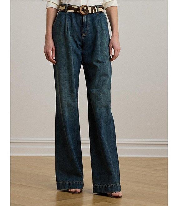 From Lauren Ralph Lauren, these jeans feature: Stretch denim fabrication High rise Wide leg silhouette Belt loops Sits above the natural waist Slim through the hip and thigh with a flared leg. Front waist pleats. Creases run down the front and back of each leg Two front waist angled pockets Two back waist welt pockets Back waist darts “Lauren Ralph Lauren”–engraved corozo button Zip fly with a signature buttoned closure Approx. 32.5" inseam, 12.25" rise and a 25.75" leg opening Cotton/lyocell Machine washable Imported.