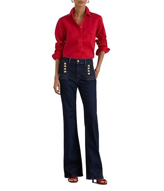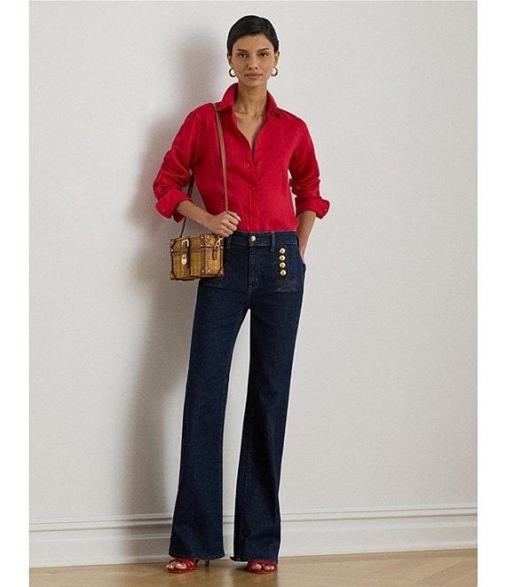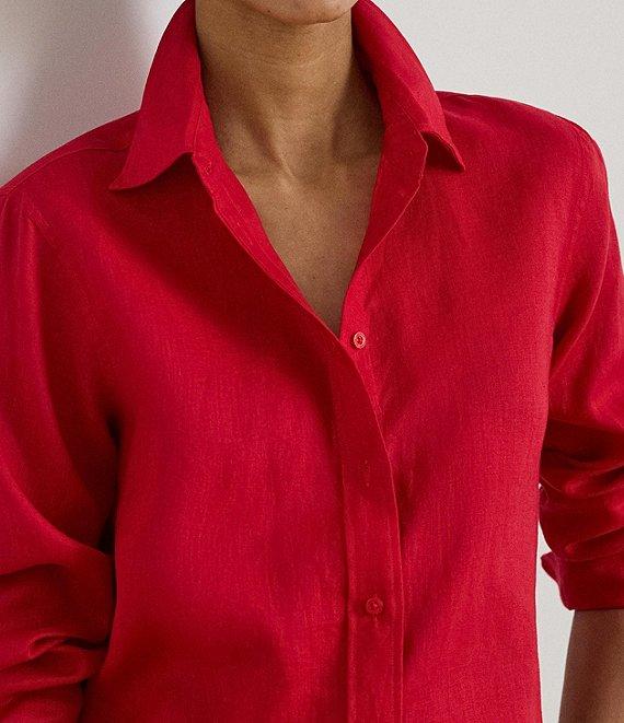 From Lauren Ralph Lauren Petite, this shirt features: Woven linen fabrication Point collar neckline Long roll-tab sleeves with buttoned barrel cuffs Pleating at the cuffs Relaxed easy fit Intended to hit at the hip Buttoned placket with buttons custom-developed with a "Lauren Ralph Lauren" logo Shirttail hem Approx. 27.5" body length; 31.5" sleeve length; body length and sleeve length are taken from the center back of the neck; sleeve length changes 1" between sizes Linen Machine wash or dry clean Imported.