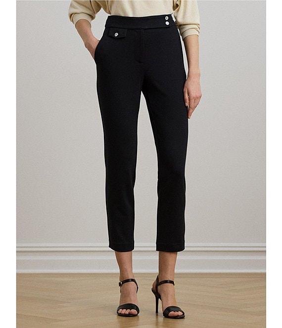 From Lauren Ralph Lauren Petite, this pant features: Slightly tapered silhouette High rise Relaxed fit Straight fit slightly tapers at the leg Two front waist angled pockets Two back waist welt pockets Decorative front right waist buttoned flap Back waist dart Zip fly with an extended waist tab and a two-button closure Approx. 27" inseam; 11.25" front rise; 13" leg opening Viscose/nylon/elastane Machine wash or dry clean Imported.