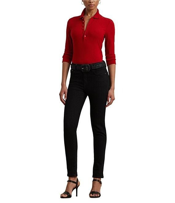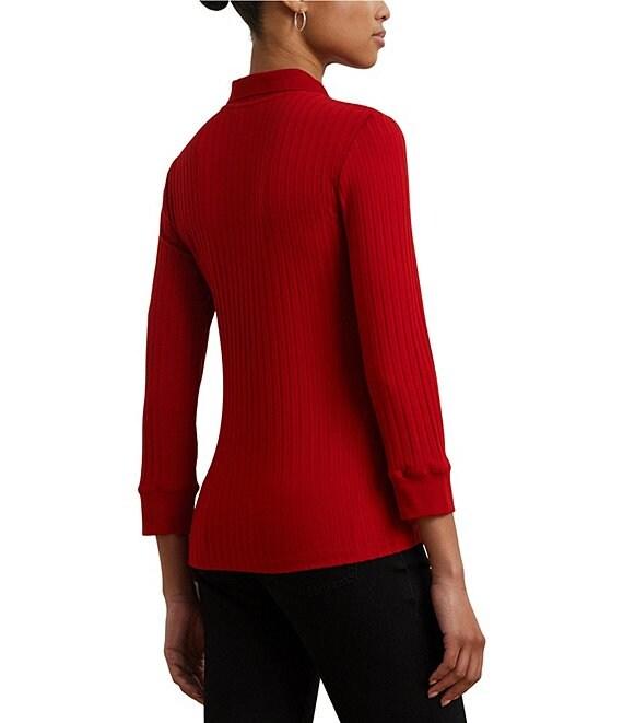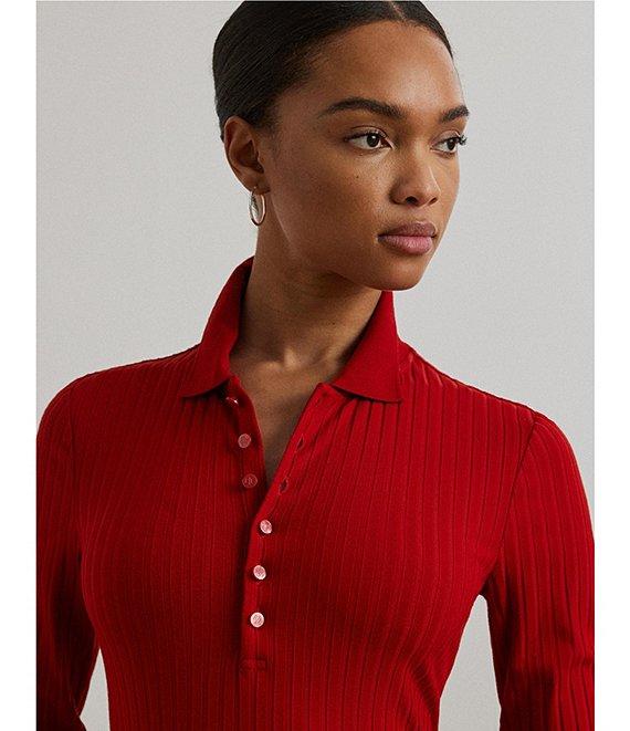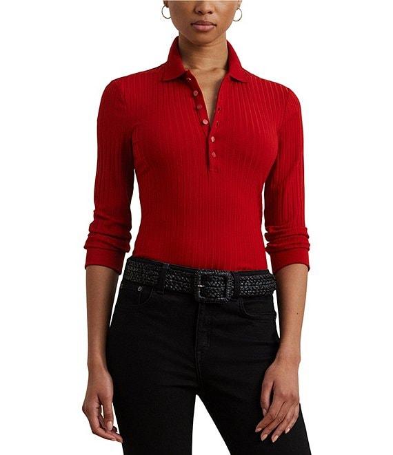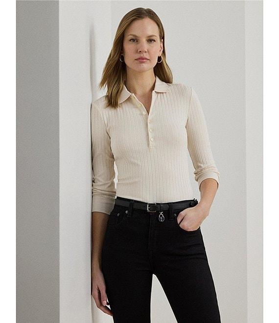 From Lauren Ralph Lauren Petite this shirt features: Ribbed knit fabrication Point collar 3/4 sleeves length with cuffs Slim fit Intended hit at the hip. LRL-engraved imitation shell buttons add a signature finish Straight hemline Pullover with half placket closure Approx. 23" length and an 18" sleeve length Body length is taken from the high point of the shoulder Sleeve length changes 0.5" between sizes Viscose/ nylon/ elastane. Machine washable or dry clean. Imported.