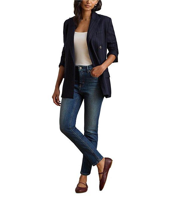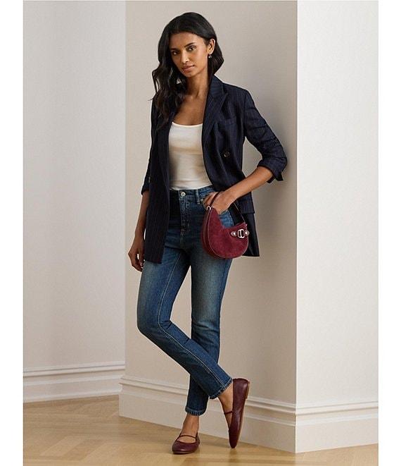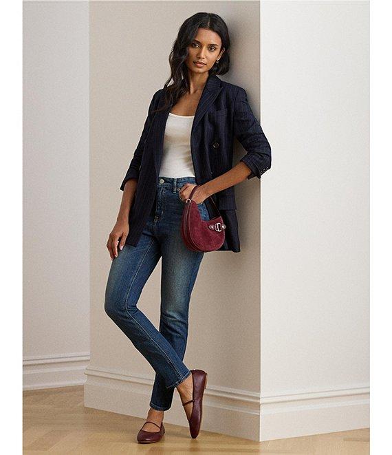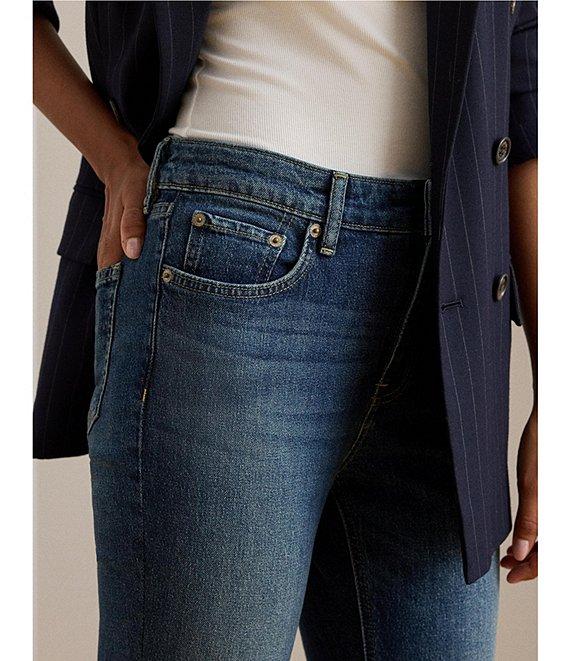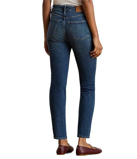 From Lauren Ralph Lauren Petite, these jeans feature: Twill denim fabrication High rise Relaxed fit Belt loops 5 pocket style Sits above the natural waist Slim through the hip and the thigh with a slim, straight leg Slimming interior panels lift and shape Debossed signature leather patch at the back right waist Ankle length Metal button and rivets custom-developed with a "Lauren Ralph Lauren" logo Front button and zipper closure Approx. 26" inseam, 14.25" leg opening, 11" rise Cotton/elastane; logo patch: leather Machine washable or dry clean Imported.