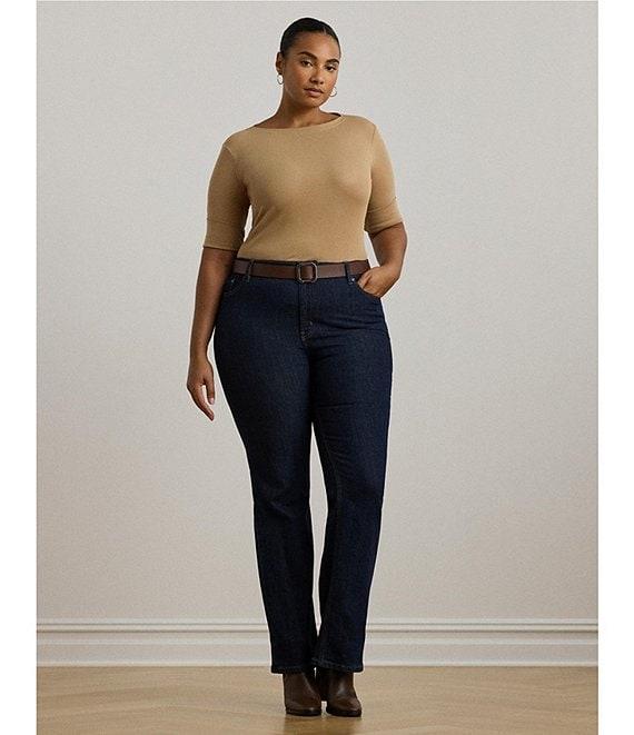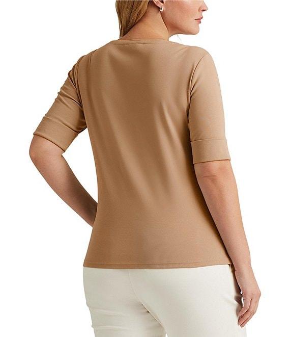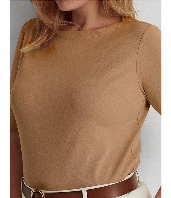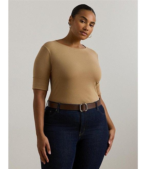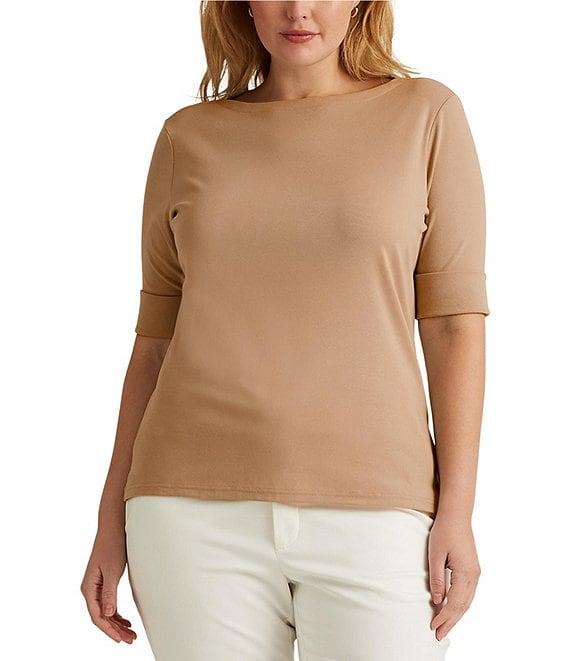 From Lauren Ralph Lauren Plus, this tee features: Stretch-infuse cotton fabrication Tee silhouette Boat neckline Elbow length sleeves with folded cuffs Embroidered logo Slim fit Side slit hemline Pullover construction Approx. 27" length Cotton/elastane Machine wash Imported.