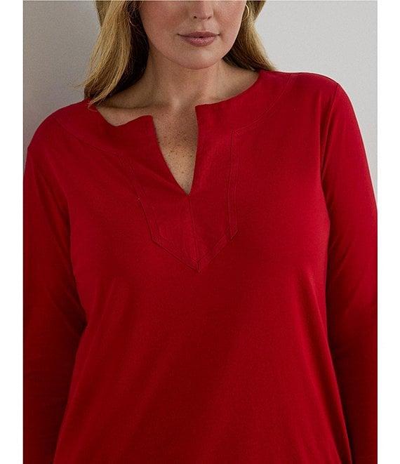 From Lauren Ralph Lauren Plus, this tunic features: Soft and breathable cotton jersey fabrication Split v-neckline 3/4 length sleeves Relaxed fit Intended to hit at the hip Straight hem with side slits Pullover construction Approx. 29.5" body length and a 20" sleeve length Body length is taken from the high point of the shoulder Cotton Machine washable or dry clean Imported.