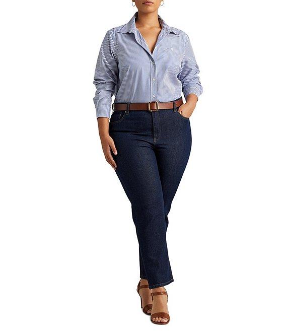 From Lauren Ralph Lauren Plus, this shirt features: Point collar neckline Long sleeves with buttoned barrel cuffs Back yoke Signature "LRL" embroidery at the left chest Buttoned placket with signature "Lauren Ralph Lauren" buttons Shirttail hemline button front closure Approx. 28.5" length Cotton/elastane Machine wash/tumble dry Imported. Treated with a no-iron finish, this classic shirt adorned with “LRL” embroidery is a wear-to-work must-have.
