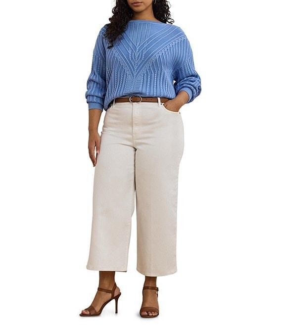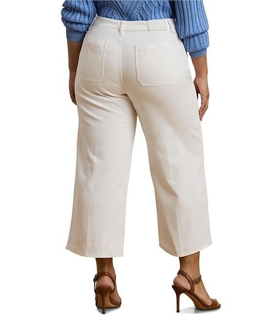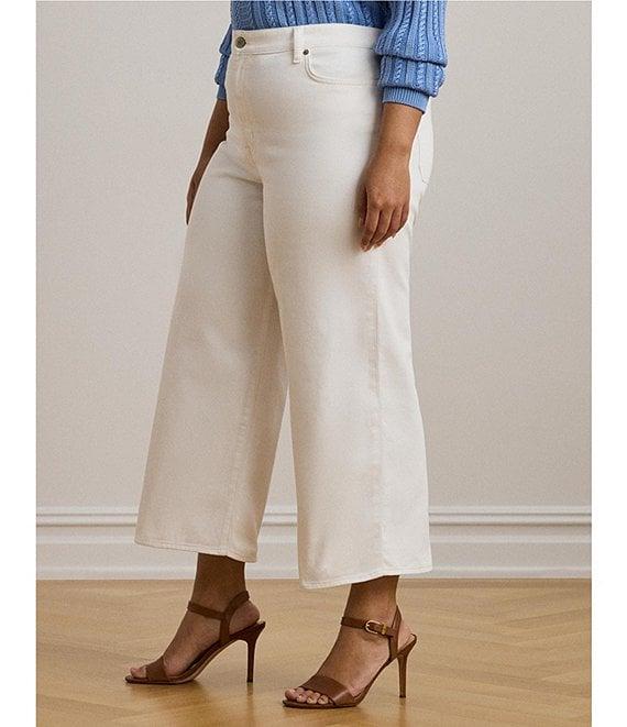 Lauren Ralph Lauren Plus, these jeans feature: Stretch denim fabrication High-rise Wide-leg Belt loops Sits above the natural waist Five-pocket styling with signature metal rivets Debossed signature leather patch at the back right waist Creases run down the front and back of each leg Double back waist darts Fitted through the hip with a relaxed thigh and a wide, cropped leg Waist darts and crisp creases at each leg create a tailored finish Zip fly with a signature buttoned closure Approx. 13.25" rise and a 24" leg opening All sizes have a 24" inseam Cotton/elastane Machine wash/tumble dry Imported.