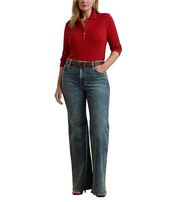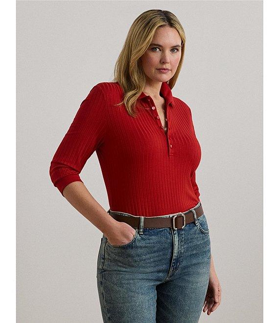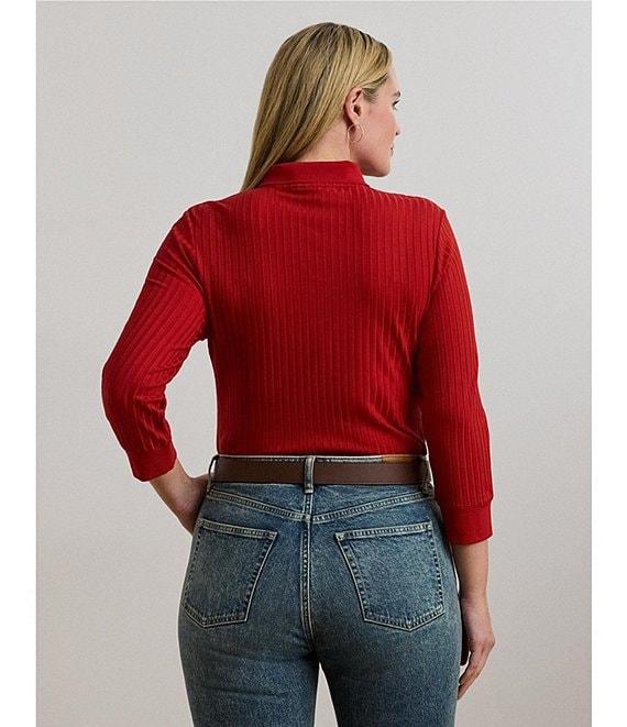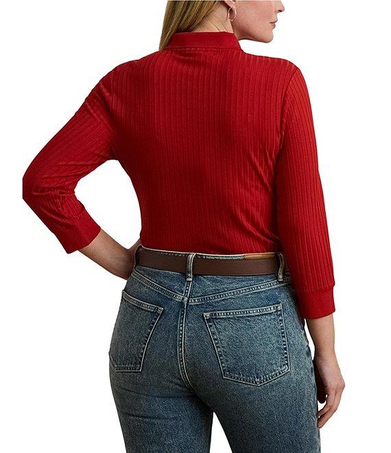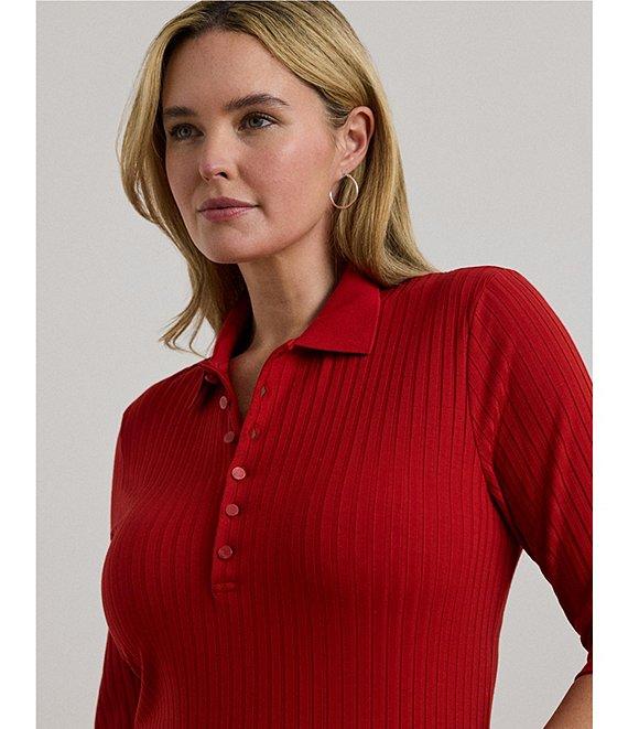 From Lauren Ralph Lauren Plus, this shirt features: Ribbed knit fabrication Point collar 3/4 sleeve length with cuffs Slim fit Intended hit at the hip. LRL-engraved imitation shell buttons add a signature finish Straight hemline Pullover with half placket closure Approx. 27.75" length and an 19" sleeve length Body length is taken from the high point of the shoulder Sleeve length changes 0.5" between sizes Viscose/ nylon/ elastane. Machine washable or dry clean. Imported.