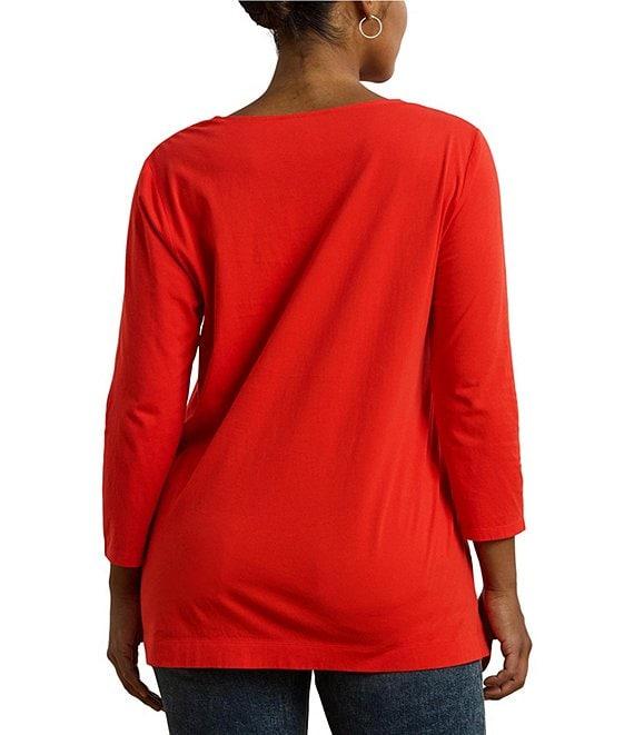 From Lauren Ralph Lauren Plus, this top features: Cotton jersey fabrication Tunic silhouette Split v-neckline 3/4 sleeves Relaxed fit Side split hemline Pullover construction Approx. 29.5" length Cotton/linen Machine wash or dry clean Imported.